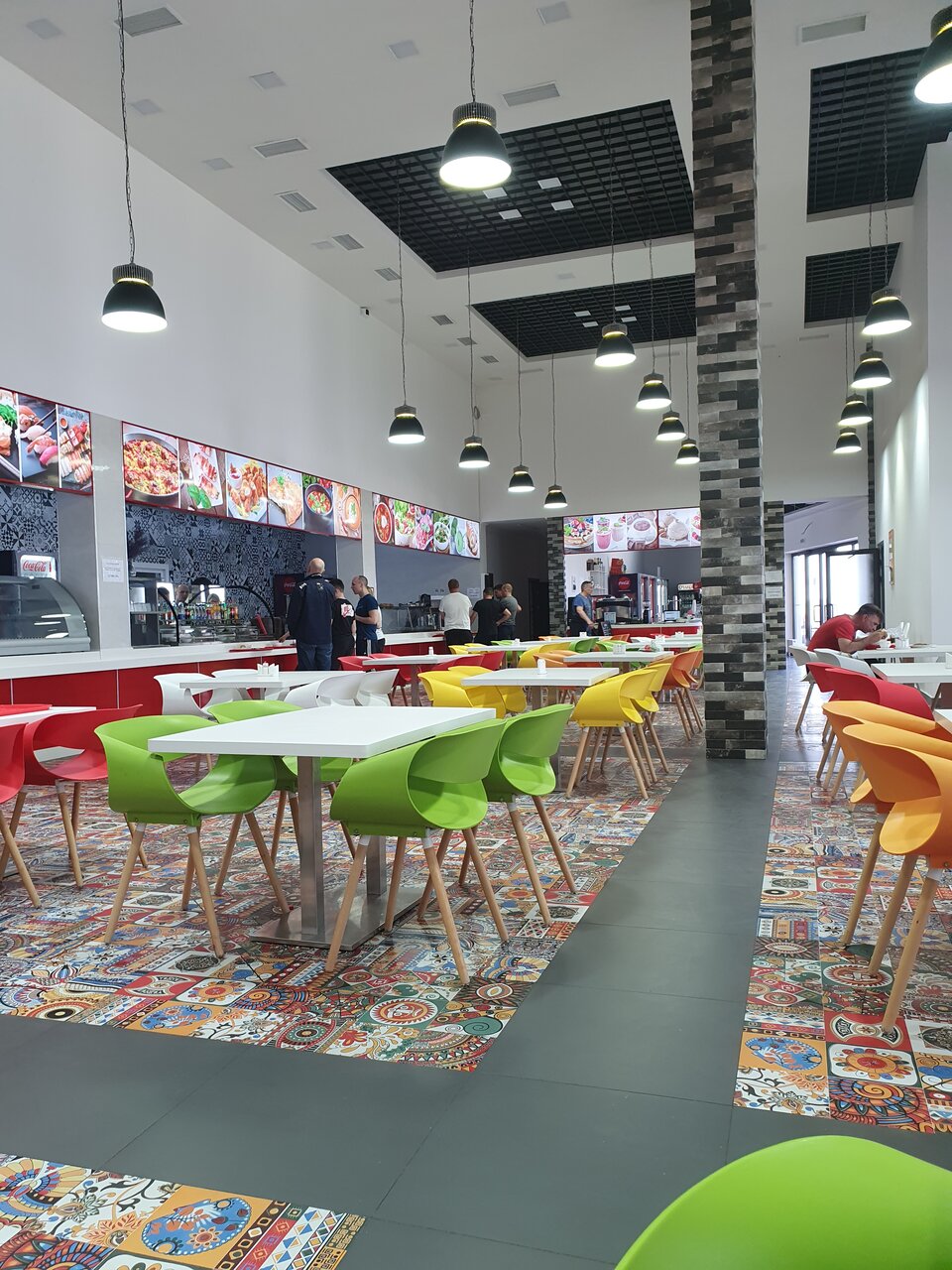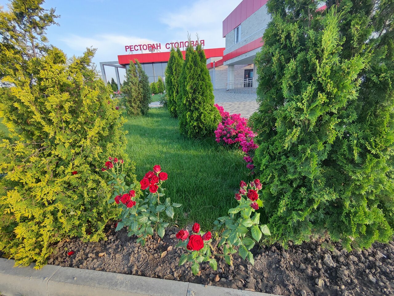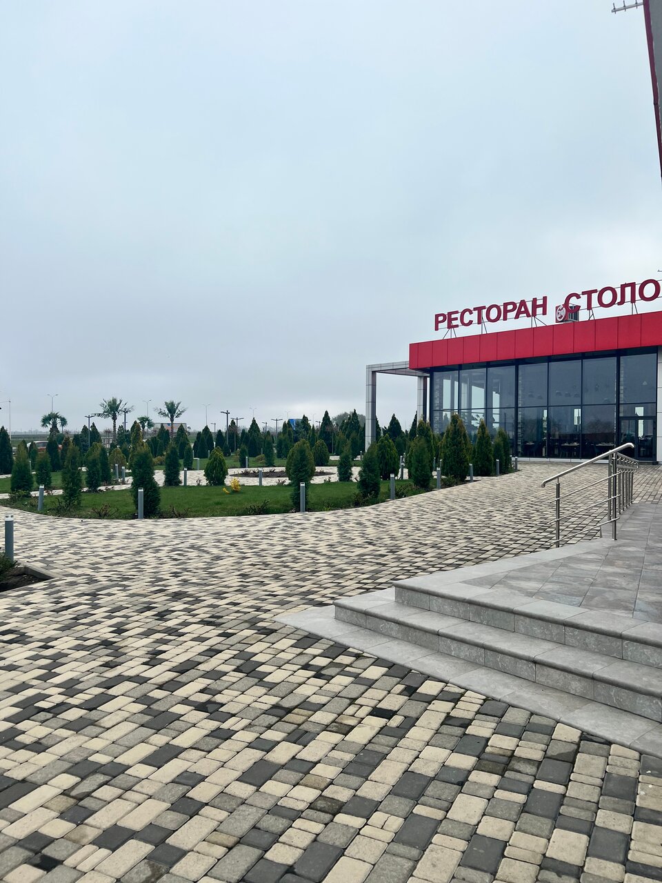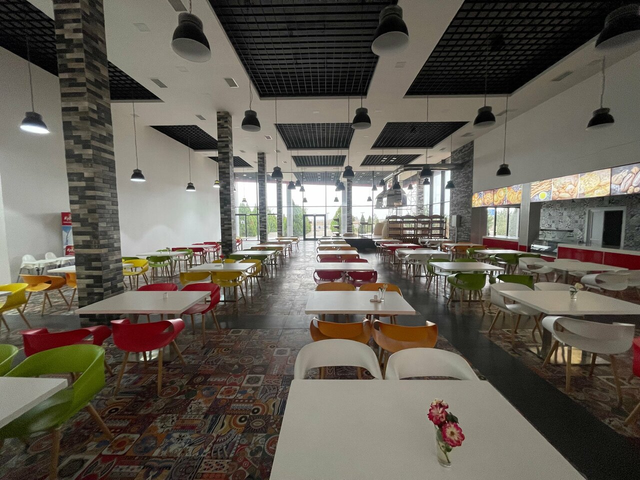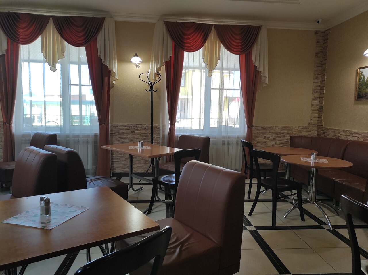 В гостинице не начевал на стоянке стоял.фут корт. Разнообразее блюд и закусок, ценник норм. Все съедобно. Перитория огромная что в нутри что с наружи. Отдохнуть и покушать по дороге к морю самое то.