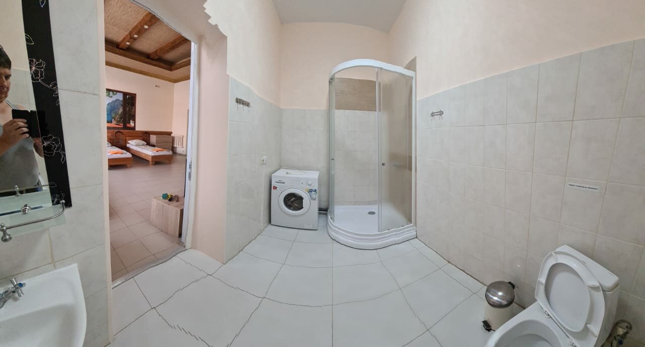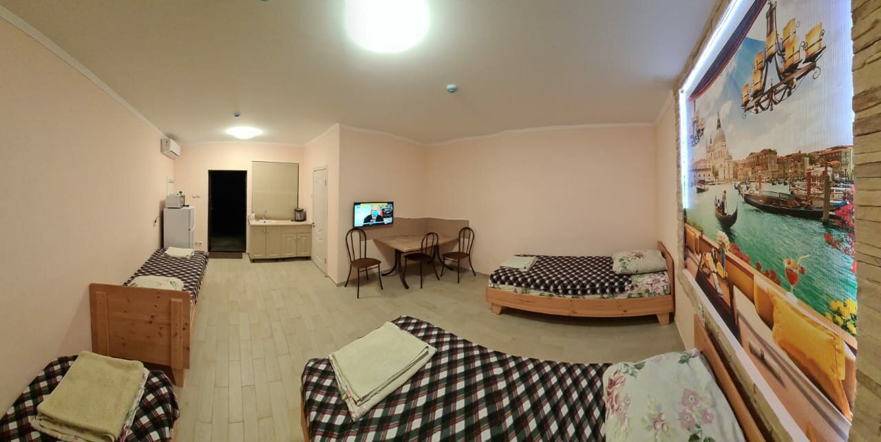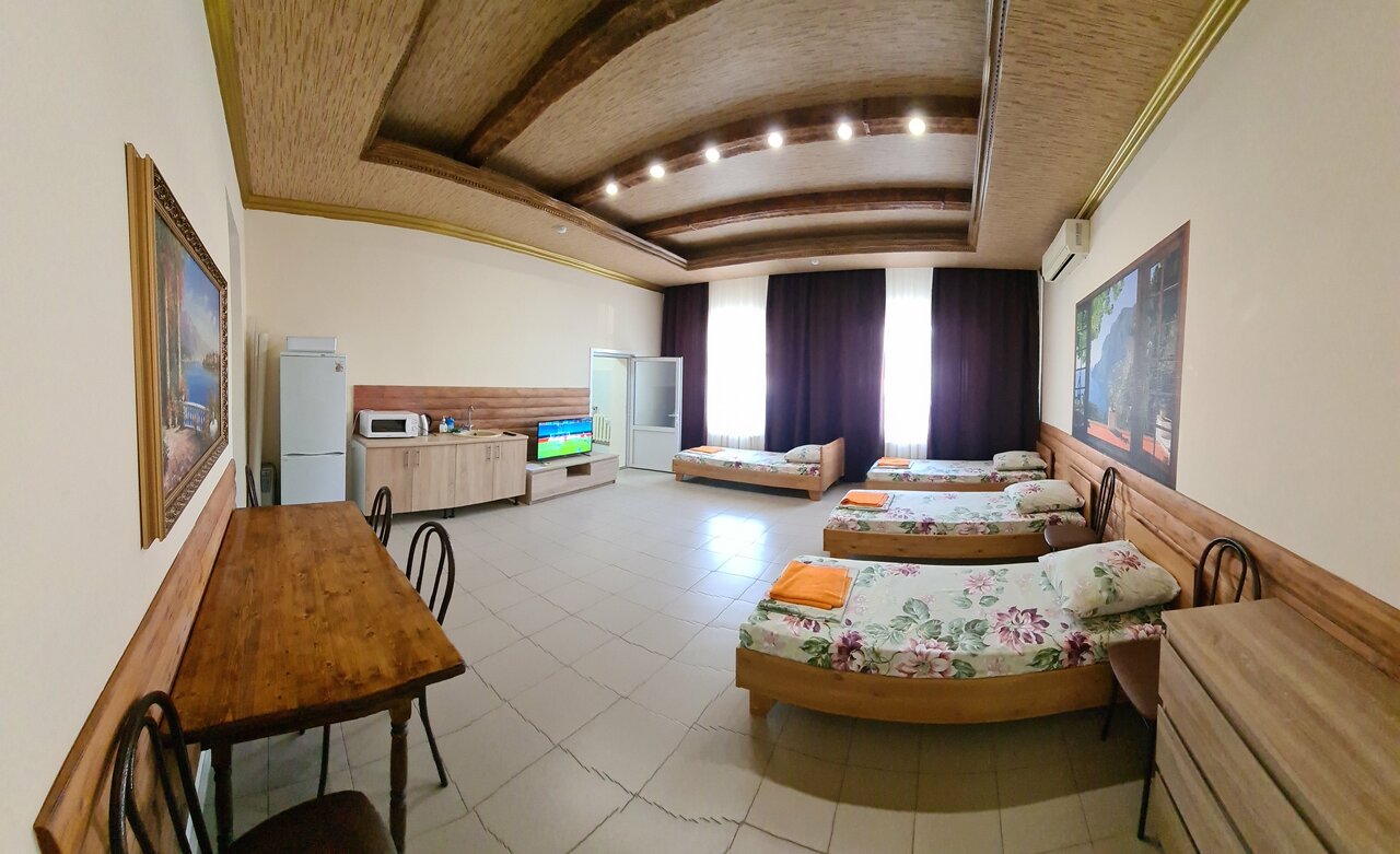 Разные номера с отдельным входом 4-5 мест,чистенько, парковка у двери, цена 3000 за номер.Есть вай фай .в номере свой сан.узел, тв, сплит, мини кухня ,чайник, холодильник, микроволновка, посуда, стол обеденный.