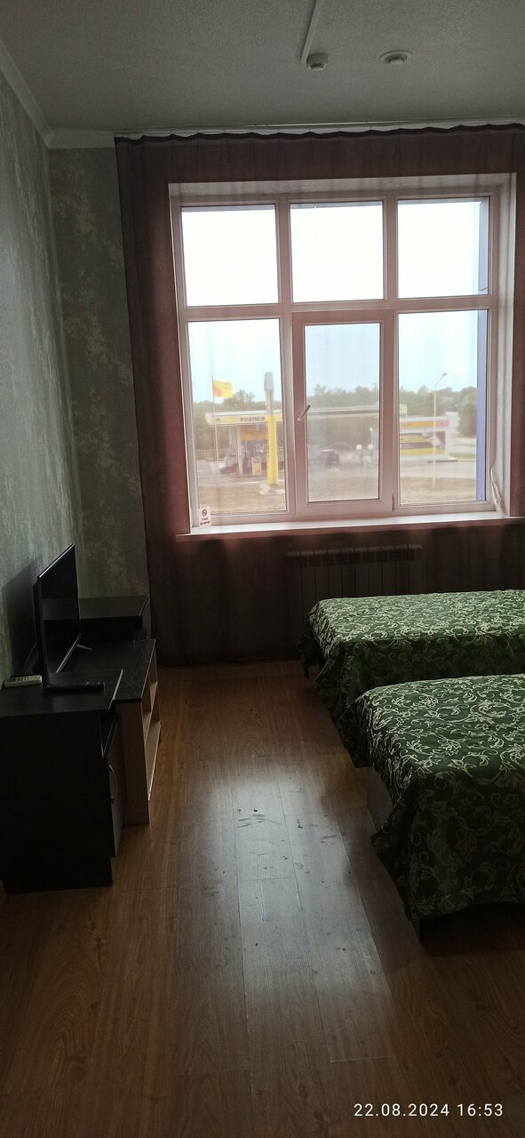 Типовой придорожный отель. Сначала нужно найти администратора. Заселение по паспорту. Номера весьма уставшие. Кондиционер старенький, но работает. Отделка, полы, кровати тоже. Матрасы не продавленные, подушки на любителя, маленькие. Бельё чистое. В шкафу вешалок нет. Посуды нет. Тапочек нет. Два полотенца (номер двухместный). Стульев нет. Чисто переспать. Душевая с занавеской, санузел. Вода тёплая есть. За полторы тысячи это почти полулюкс. Недостаток: нет телефона для бронирования, заселение по факту приезда. Холодильник есть. Чайника, кулера нет. Рядом кафе, мини-маркет на заправке. Телевизор 20 каналов российских. Вай-фай ловится возле двери, сигнал слабенький.