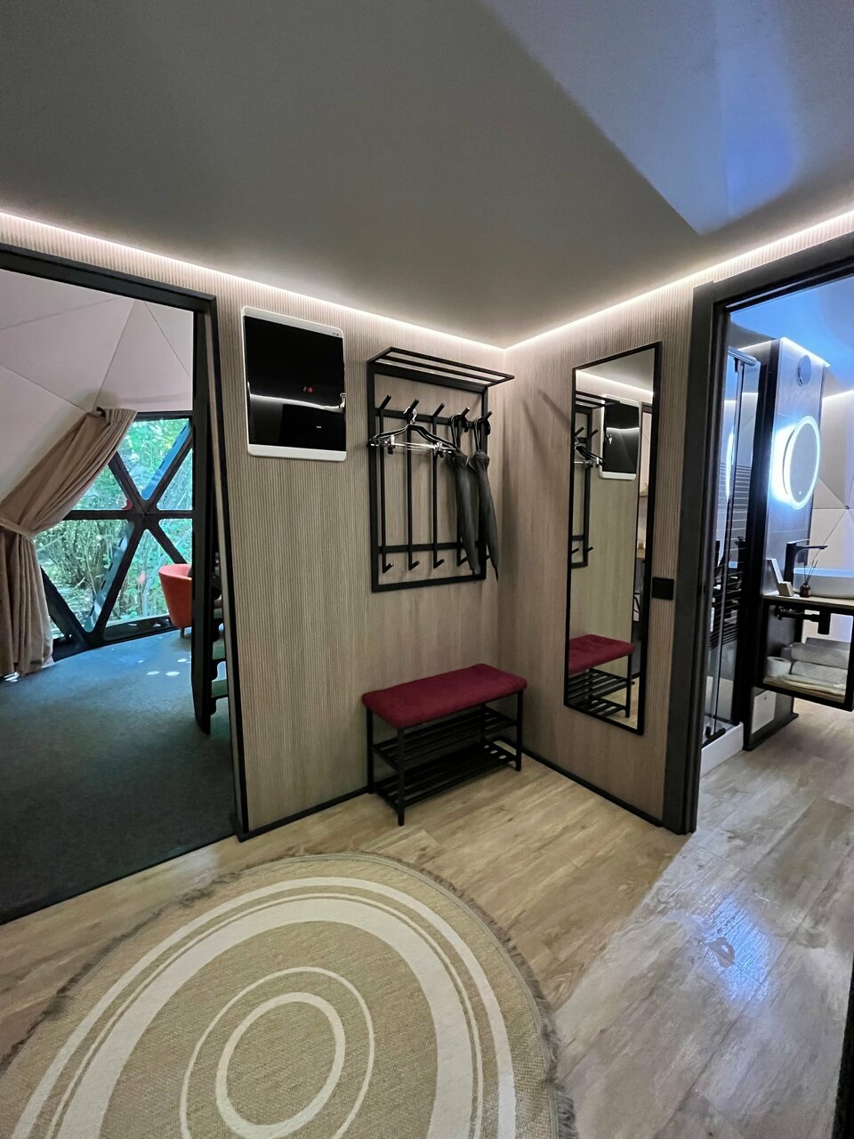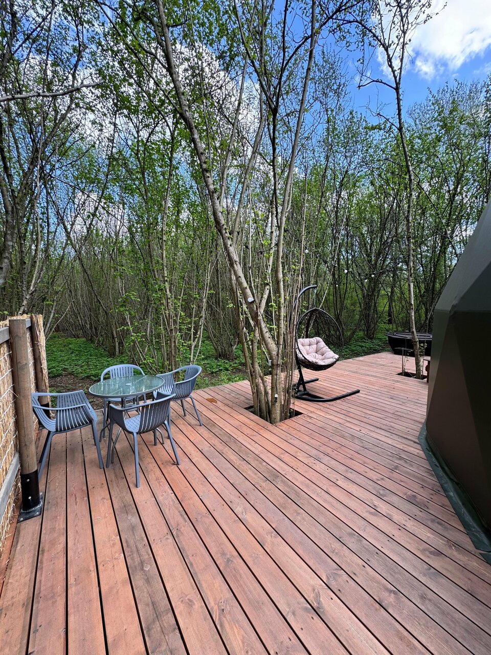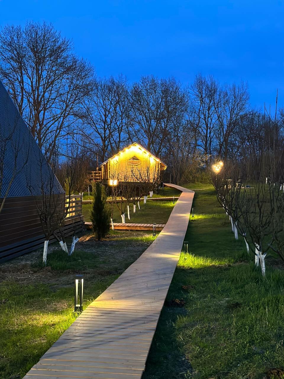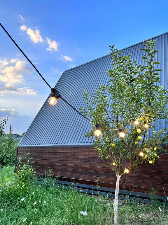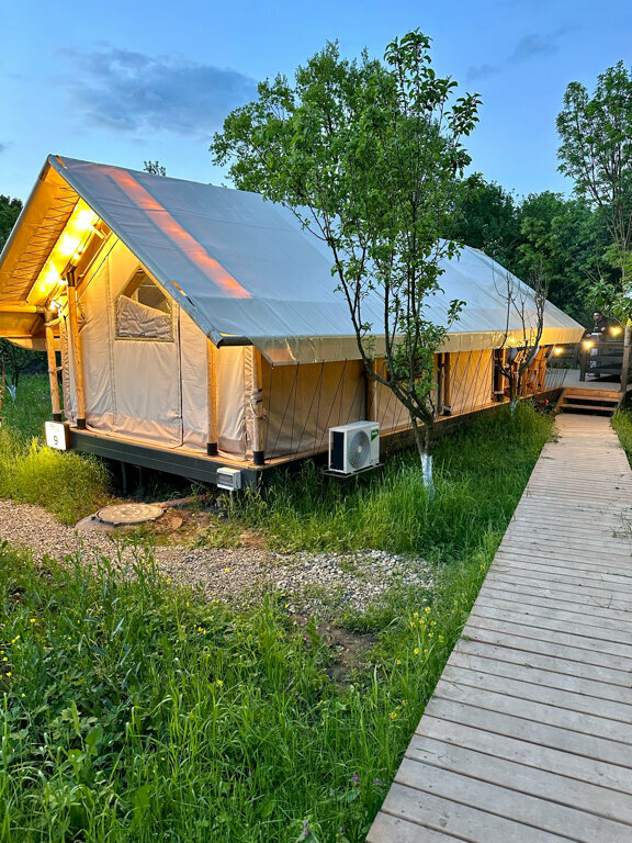 Очень понравилось, всё как пишут в остальных отзывах, когда тишина, то слышно даже зверей в лесу рядом ( предположительно мы слышали оленей) Территория большая, и при том что домики были все заняты, в бассейне и спа мы ни с кем не пересекались! Что очень было удивительно! Вкуснейшие яблоки созревают, сорвали парочку красных спелых — красота, прям возле палатки Вечером всё в гирляндах, фонариках. Очень понравилась зона с костром. Его просто разжигает вечером персонал, рядом дровница, и кресла Кино 2 сеанса разные фильмы, в 19 и 21, всё во время Что огорчило — обед из ресторана задержали доставку на 2 часа, за доставку еды ещё доплачиваешь 500-600 средний чек обеда на троих у нас вышел 3000 Не хватило микроволновки в номере, но нам разогрели на ресепшене