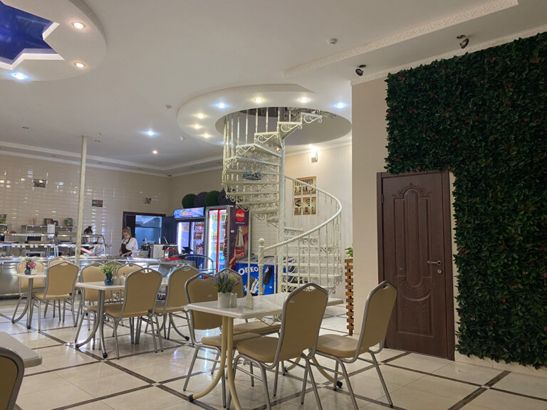 Еда вкусно приготовлена, ожидания нет , все сразу подают , чисто и уютно)) зал красиво оформлен, большой и вместительный! персонал вежлив и приветлив! Очень красивый