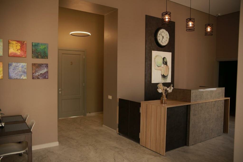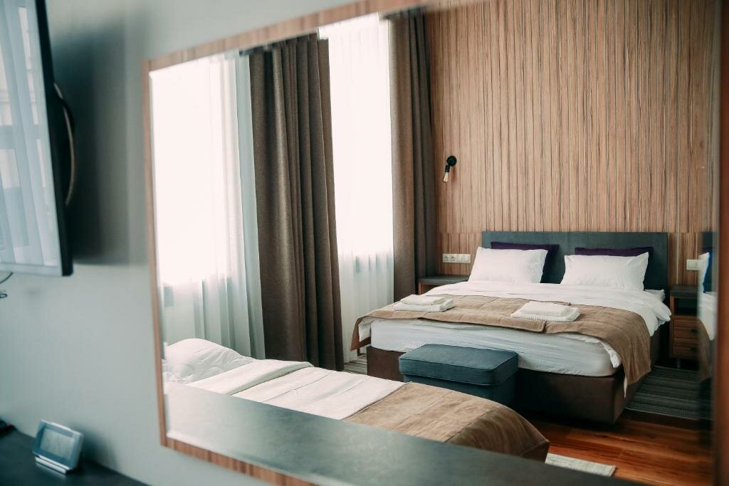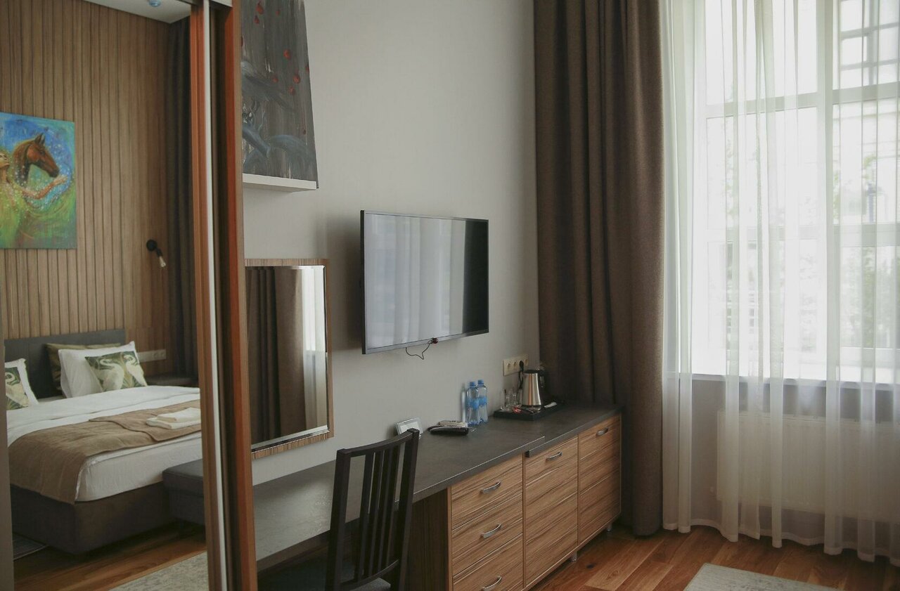Очень красивая читая новая гостиница, расположена в старинном купеческое доме, высочегные потолки, в номер все пренадлежности и даже больше, шторы блэкаут, халат, симпатичная территория с подвечными креслами зонтиками и цветами, несколько раз останавливалась тут в командировке, очень нравится, супер комфортно