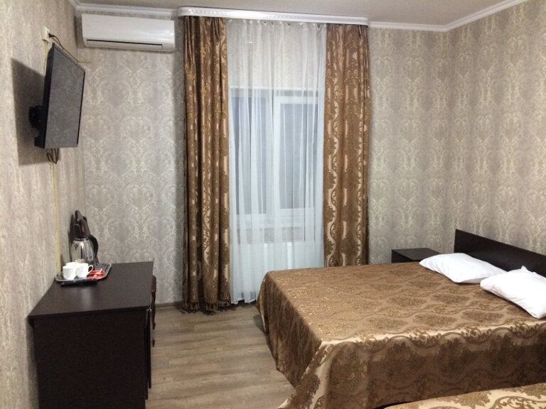 - Наличие кондиционера, телевизора.; Хорошая парковка.; Полный набор средств гигиены (полотенца, зубная паста, щетки, мыло, гель для душа, фен, тапочки).; Наличие Wi-Fi.; Удобное расположение рядом с трассой.