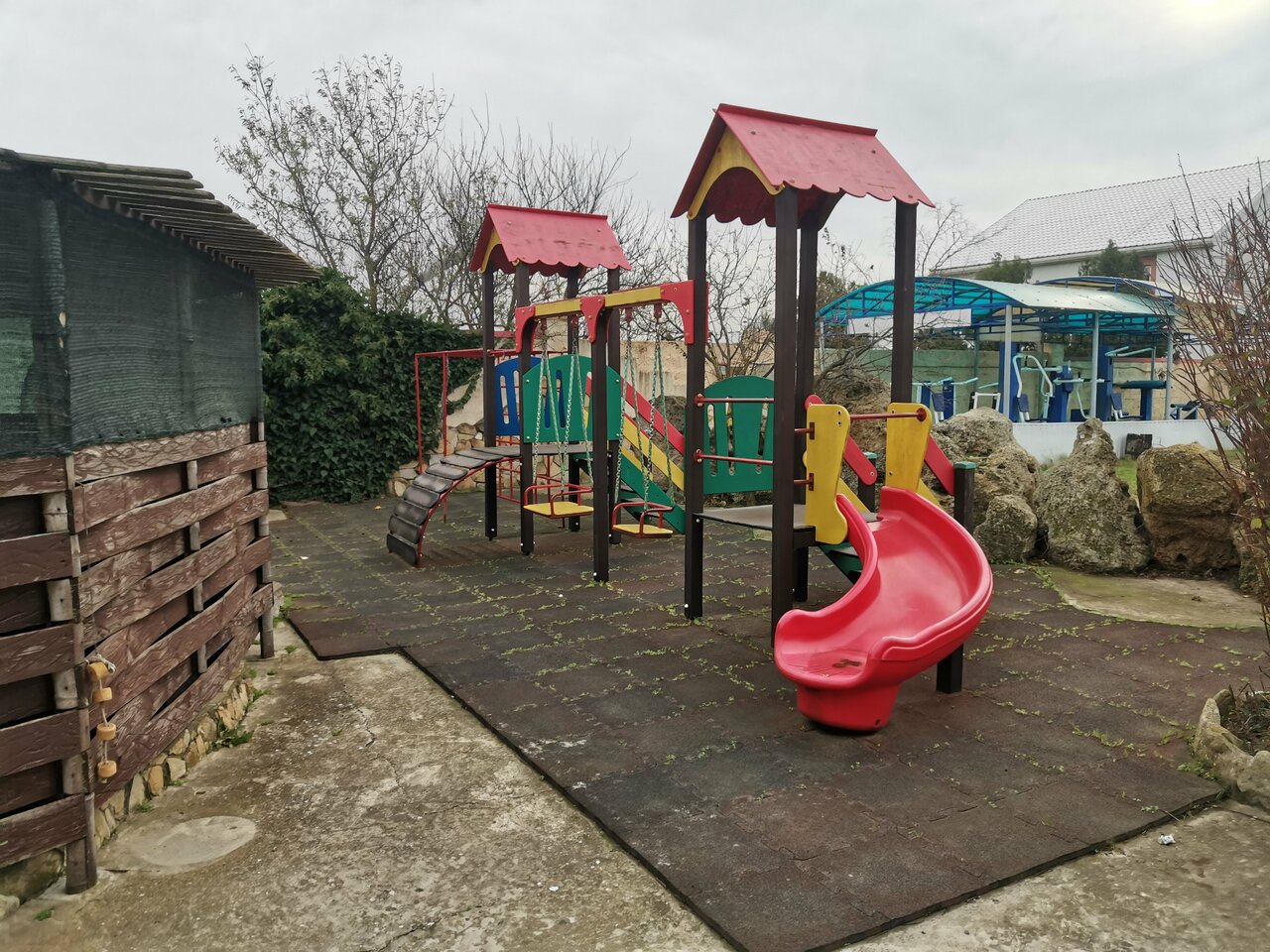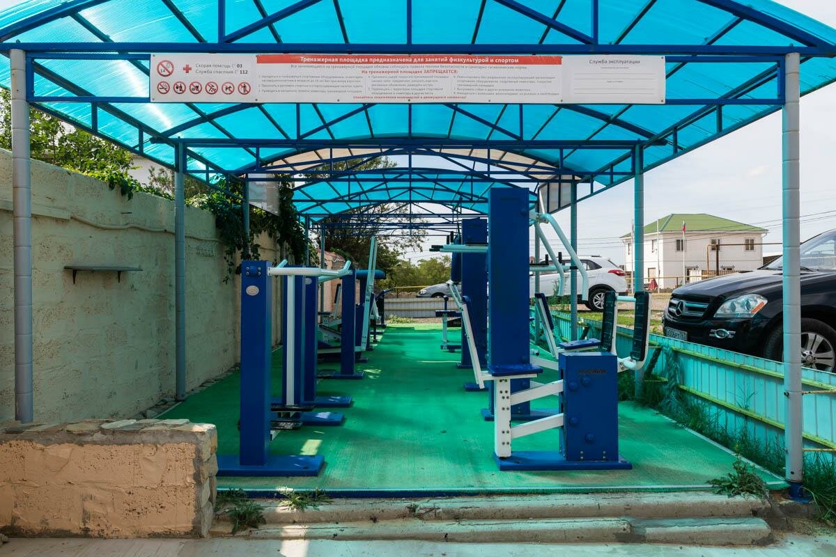 - Детская площадка, батут, тренажёры.