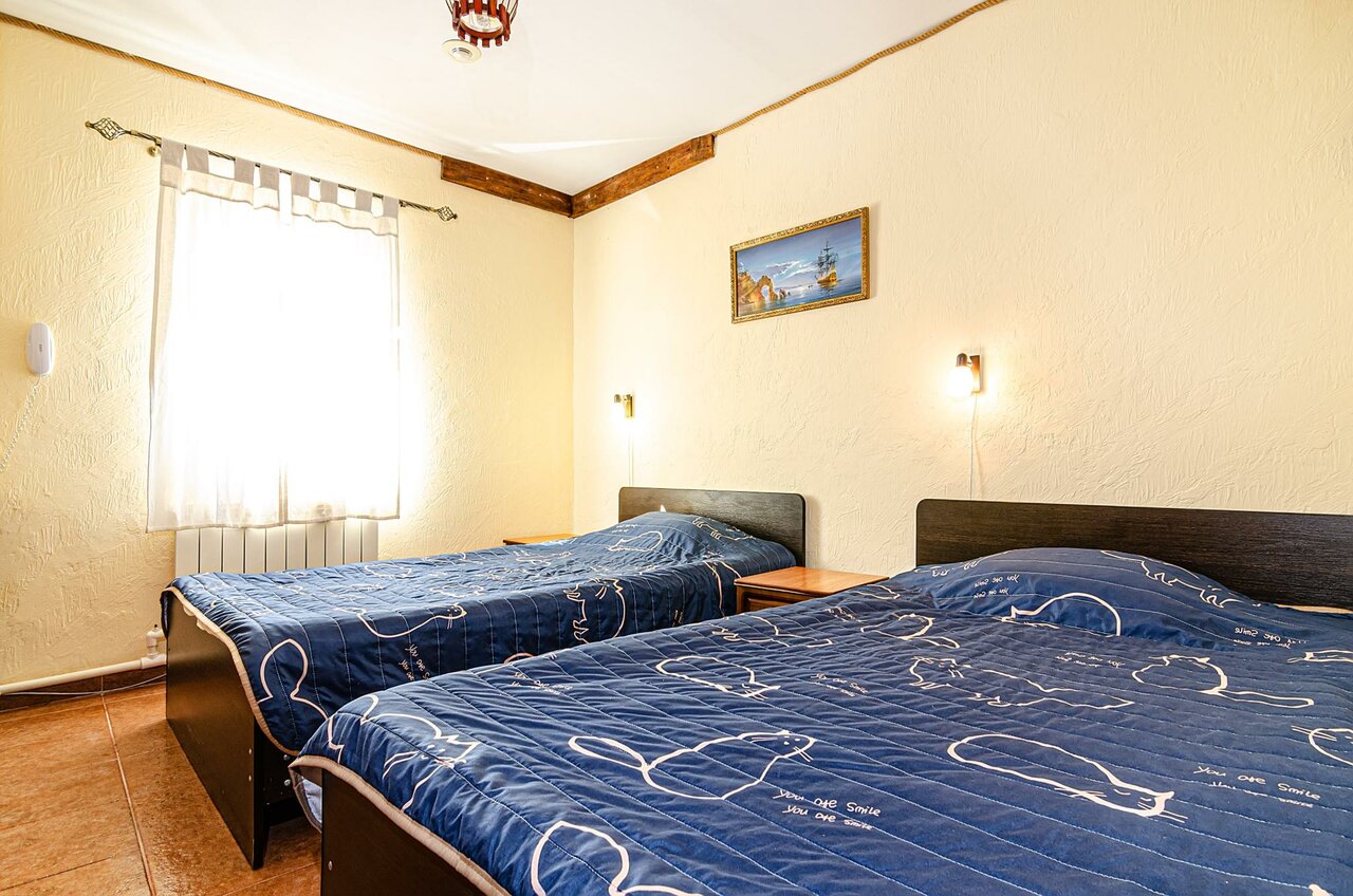 СТАНДАРТ ТВИН площадью 19 кв.м с видом на станицу Тамань или на Выставочный комплекс 'Атамань' лаконично оснащен всем необходимым для комфортного пребывания для отдыха по пути в Крым. Завтрак включён.