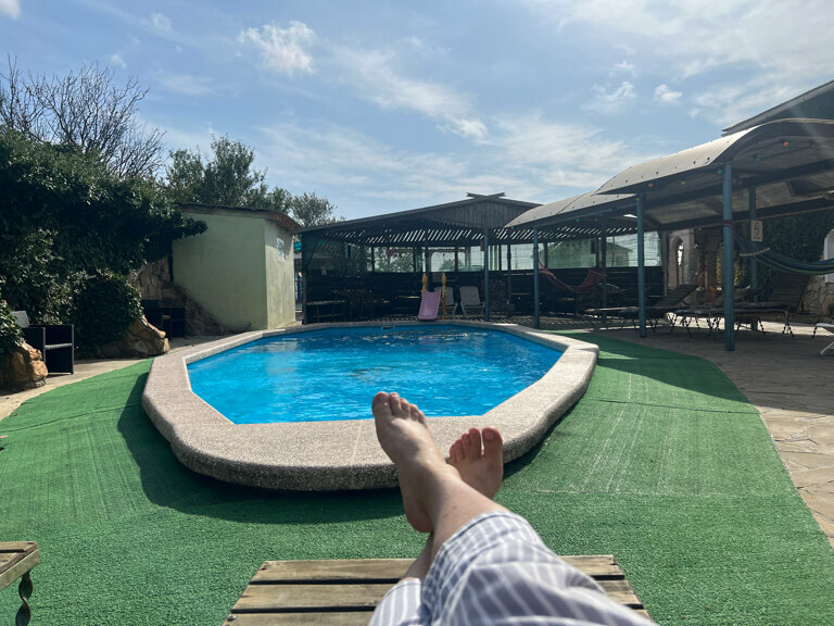 - Вкусное питание (завтраки, обеды).; Детская площадка, батут, тренажёры.; Частая уборка и смена белья.; Спокойная и аутентичная атмосфера.; Наличие бассейна.