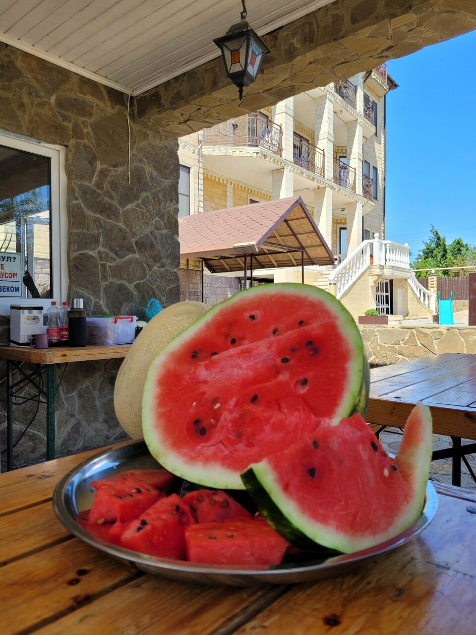 Одну звезду снимаю за качество воды, она с желтоватым оттенком и такое ощущение совершенно не фильтрованная. Есть парковка, зона барбекю, кухня.в номере чайник, холодильник, телевизор, сплит. До центрального пляжа минут 5 ходьбы. В целом на твердую 4
