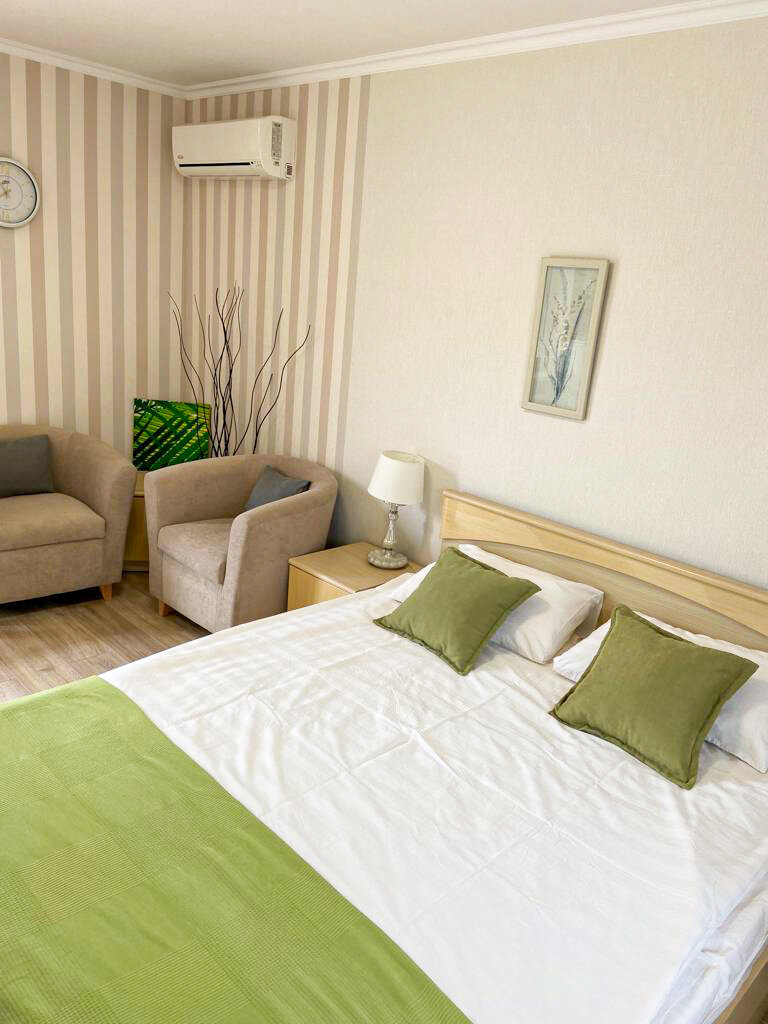 Удобства: — Холодильник, фен, телевизор, посуда — Бесплатные шезлонги, зонты, детский стульчик — Доставка еды, прачечная, уборка