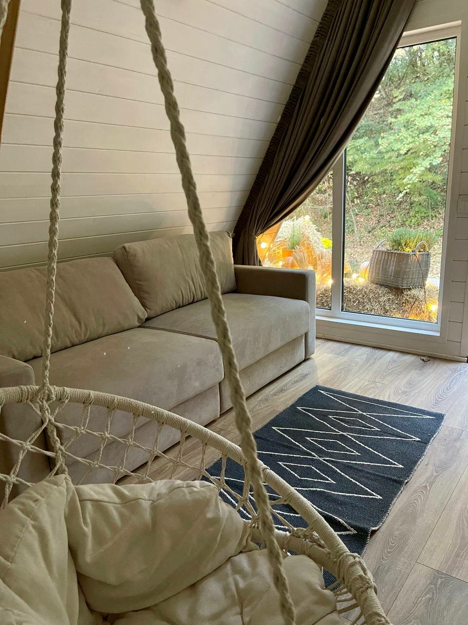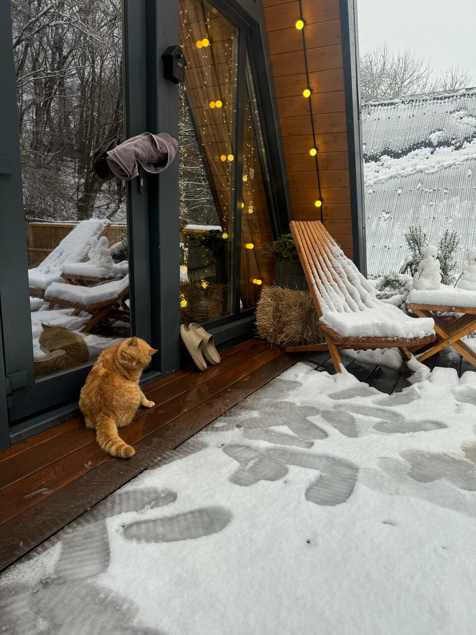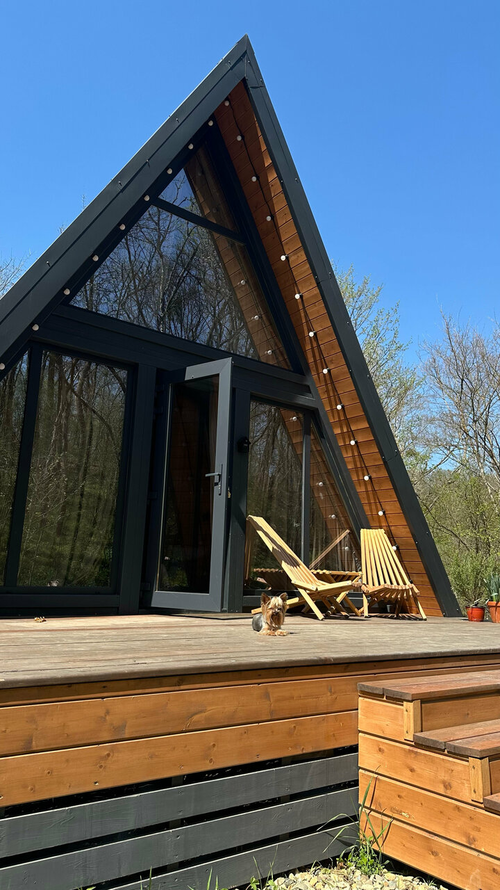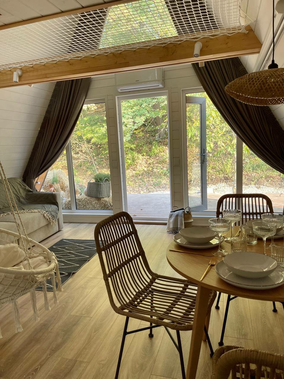 Стильный комфортабельный дом А-фрейм с понорамными окнами видом на лес . На террасе домика есть джакузи, оплачивается отдельно. Стоимость джакузи на террасе домика 4 тыс/сутки, подогревается все время в течение суток, использовать можно без огр...