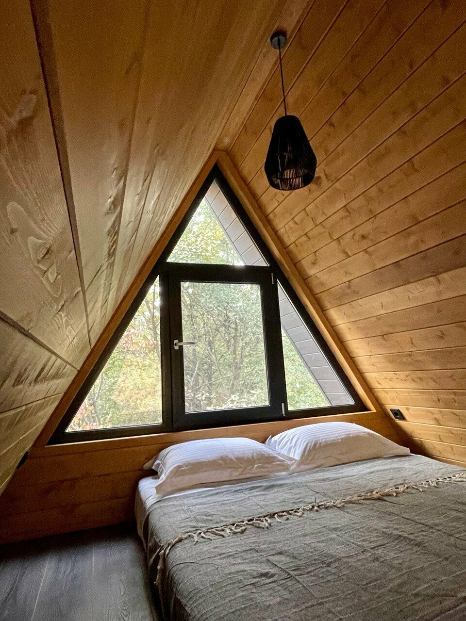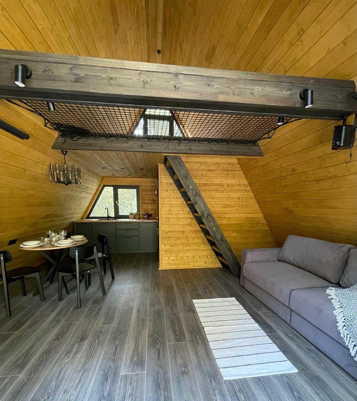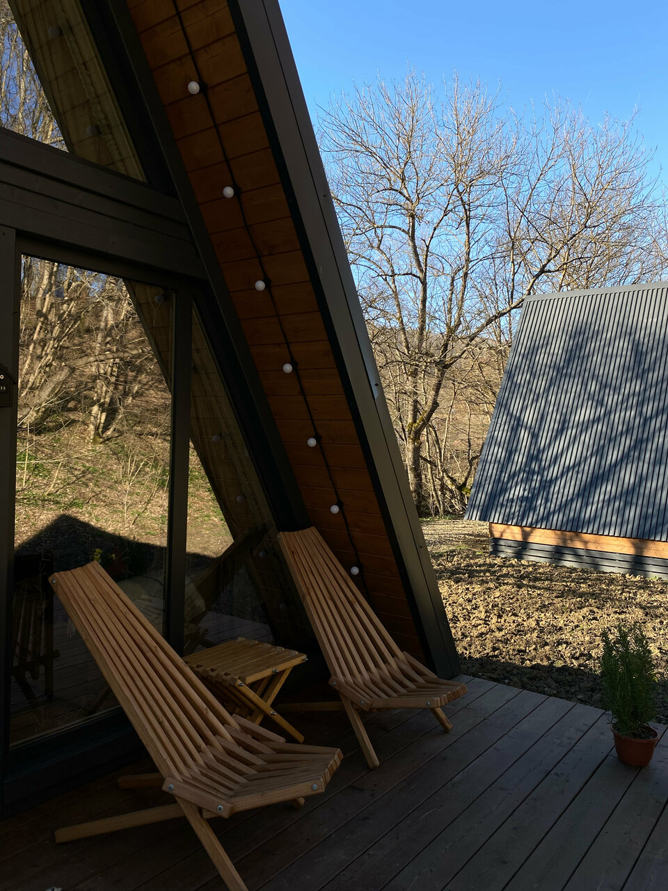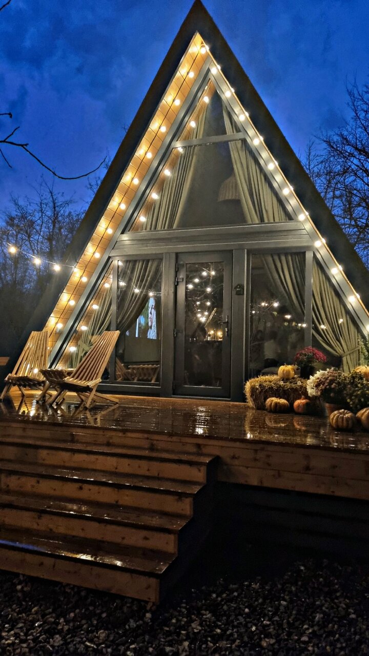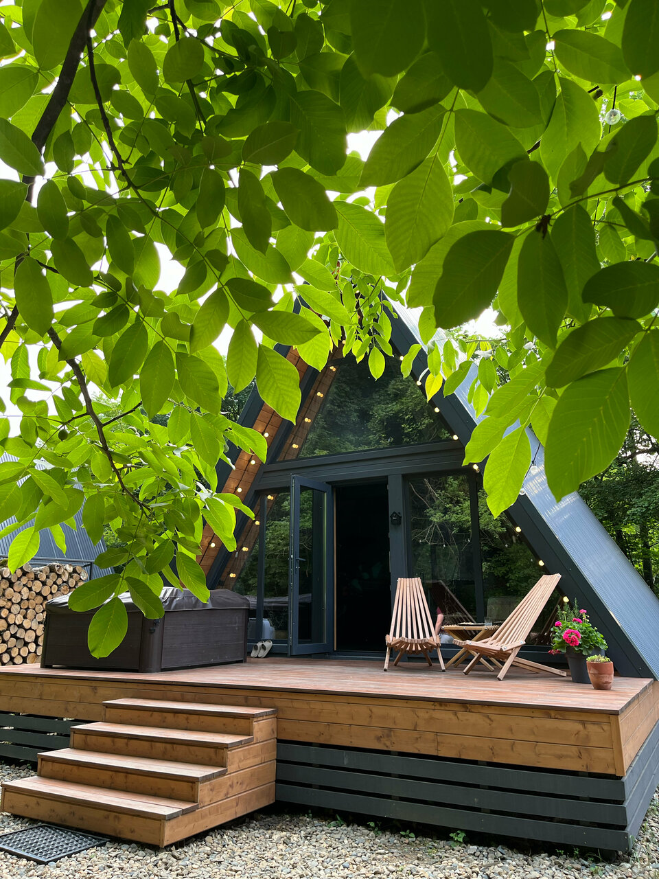 Стильный комфортабельный дом А-фрейм с понорамными окнами видом на лес . На террасе домика есть джакузи, оплачивается отдельно. Стоимость джакузи на террасе домика 4 тыс/сутки, подогревается все время в течение суток, использовать можно без огр...