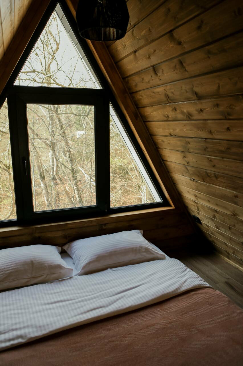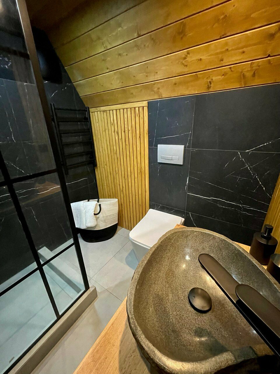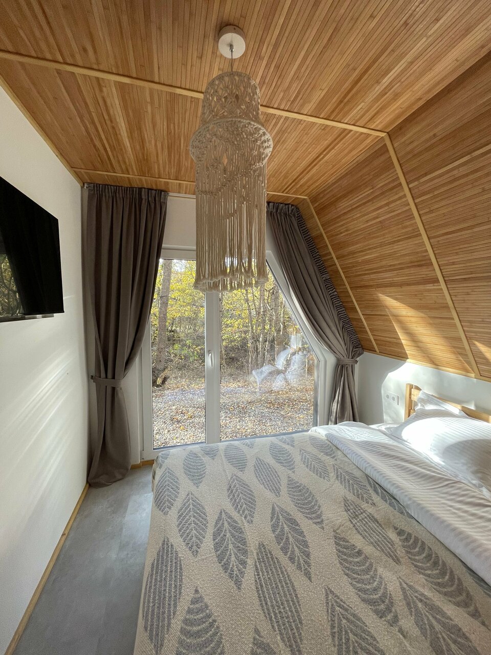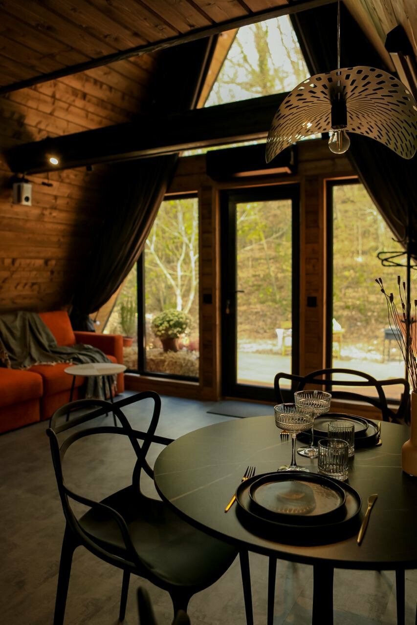 Стильный комфортабельный дом А-фрейм с понорамными окнами видом на лес . На террасе домика есть джакузи, оплачивается отдельно. Стоимость джакузи на террасе домика 4 тыс/сутки, подогревается все время в течение суток, использовать можно без огр...