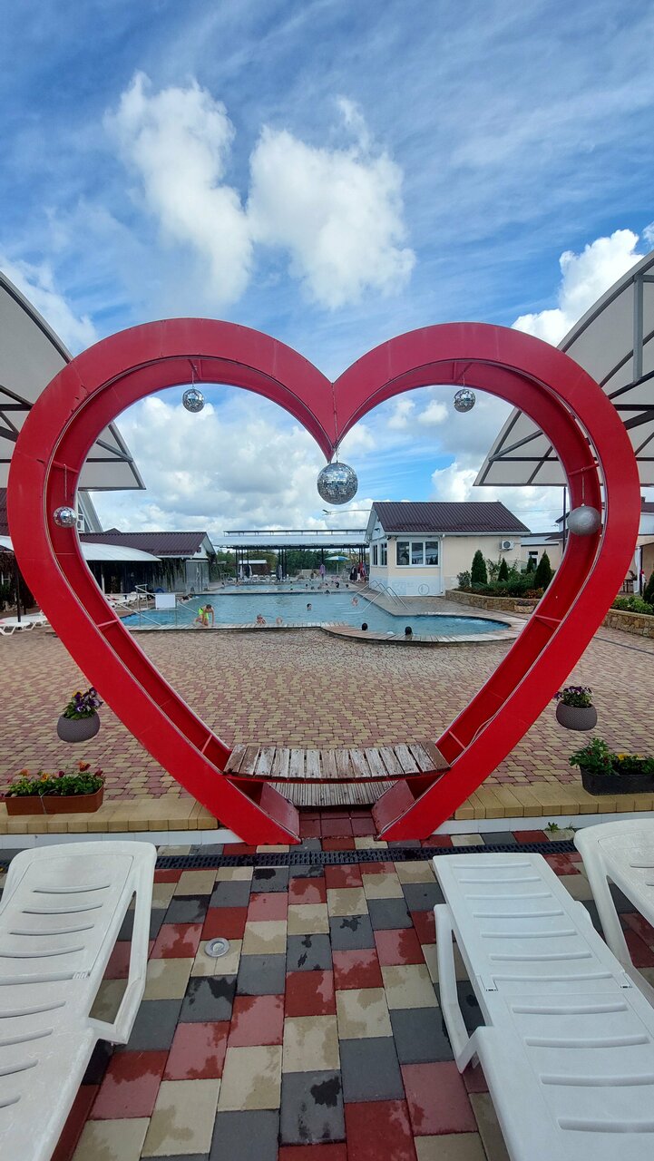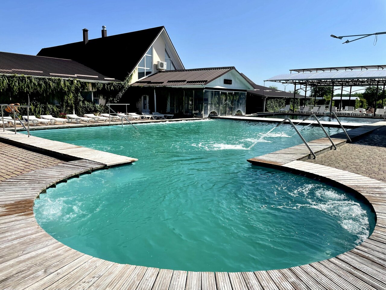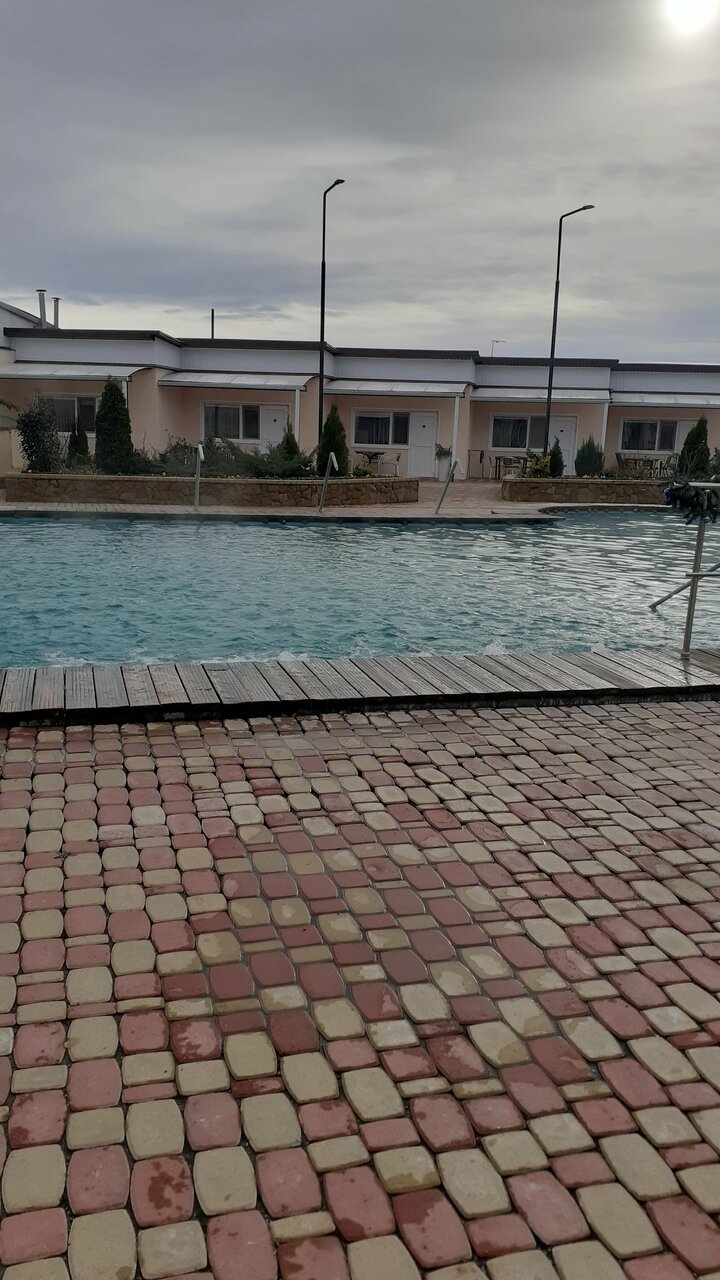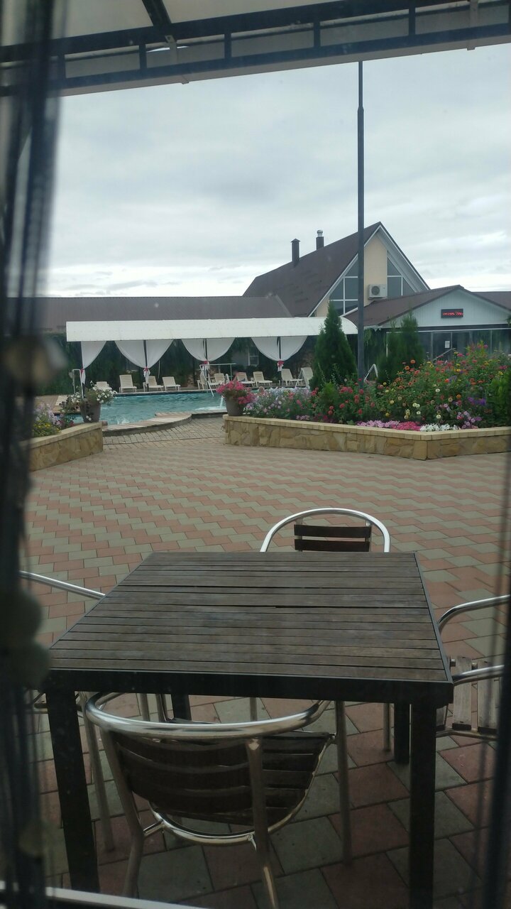 3 бассейна разной температуры и отдельно детский. Гидромассажёры. Номера бюджетные. Очень. Бармены и официанты в одном лице. Кухня хорошая и порции нормальные, плюс есть мангальная зона. Есть дневное проживание. Парковка. Место под автокемпинг.
