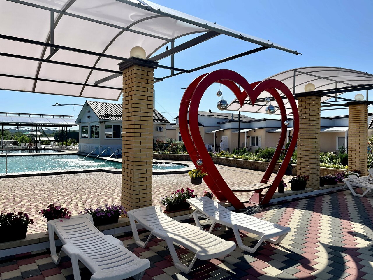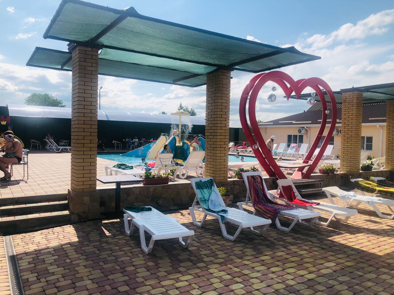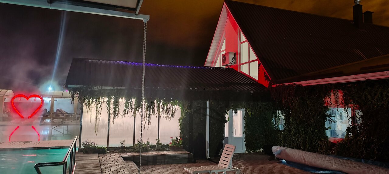 3 бассейна разной температуры и отдельно детский. Гидромассажёры. Номера бюджетные. Очень. Бармены и официанты в одном лице. Кухня хорошая и порции нормальные, плюс есть мангальная зона. Есть дневное проживание. Парковка. Место под автокемпинг.