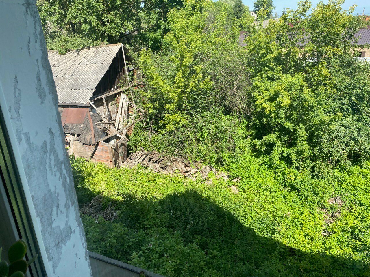 - Вид из окна на заброшенные здания.