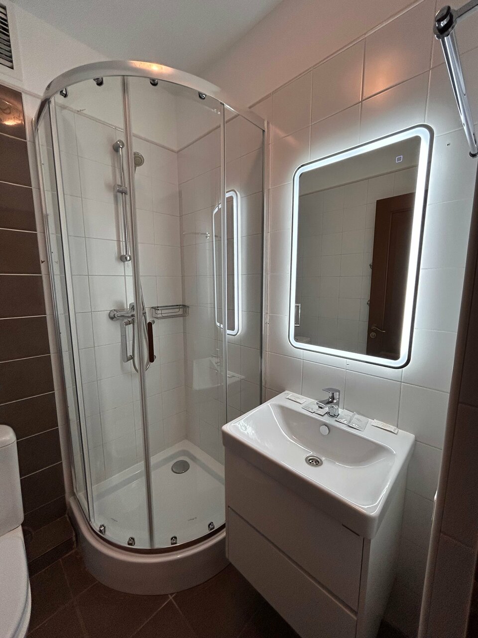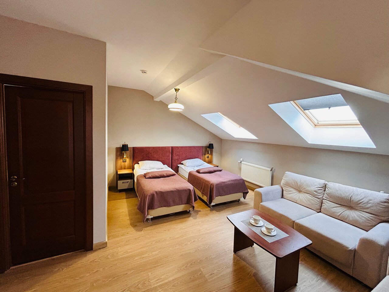 - Просторные номера (диван, две кровати, столик, душевая).