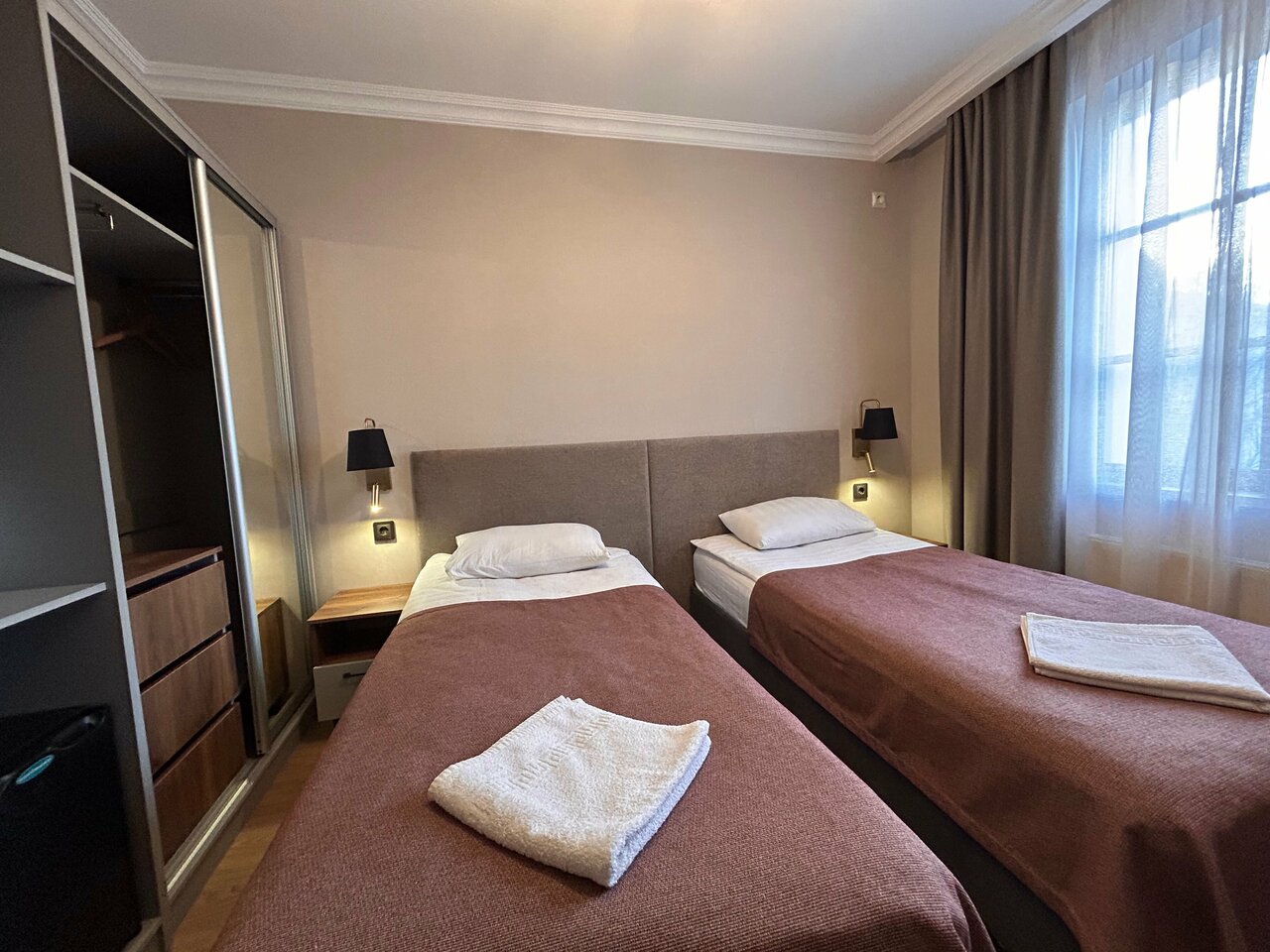 Удобно расположен, рядом с центром города, напротив санаторий Курорт с большим парком, минеральными водами и спортивной площадкой, вход в рабочие дни бесплатный. В номерах помимо заявленного на букинге есть чайник и небольшой холодильник. Не подойдёт для тех у кого в приоритете блеск и чистота, но и цена, соответственно, не высока. Наш номер на двоих за 2 тыс. за ночь был довольно просторный, с диваном и двумя односпальными кроватями, столик, душевая. Обслуживающий персонал-доброжелательный.