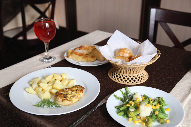 Обедали с группой. Обеды вкусные, но не очень большие порции, любителям поесть плотно может и не хватить. Обслуживали быстро, в ресторане чисто. Но хотелось бы все таки кофе подешевле. 210 р за капучино — всё-таки дороговато.