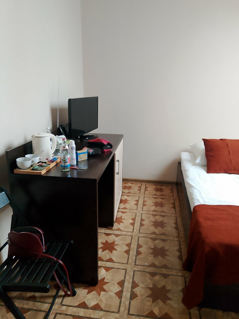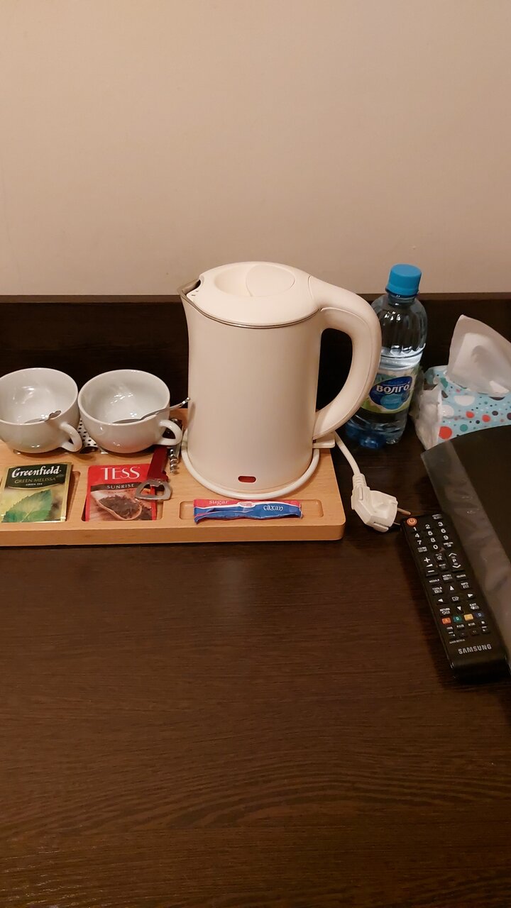 Хорошая, гостеприимная гостиница! Заселились ночью, персонал приятный и радушный. В номере чисто, аккуратно, есть электрический чайник, чашки, чай в пакетиках и сахарный песок. Остались довольны.