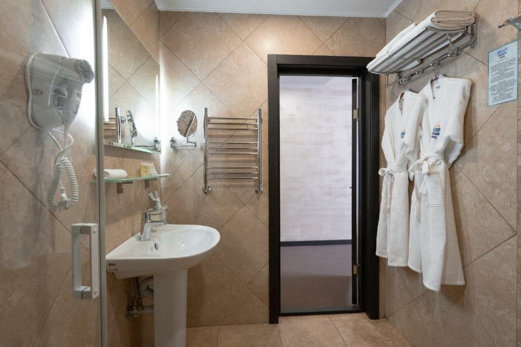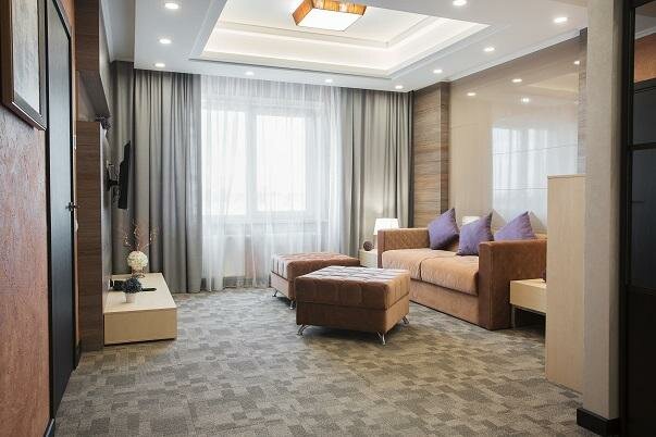 Очень приличный отель, особенно в рамках Старого Оскола. Есть большой конференц-зал, в проживание отеля входит посещение тренажерного зала и банного комплекса с бассейном. Довелось пожить в 2-х номерах и к ним претензий не было — большие комфорт плюс (есть несколько типов, различаются преимущественно площадью) номера с большой кроватью, местом для работы. В некоторых номерах душевые кабинки, в некоторых ванны. Из нюансов — однообразные завтраки в лобби — при проживании дольше 3 дней, становится скучновато на завтраке. При отель есть ресторан, из которого можно заказывать блюда в номер. Wi-Fi есть по всему отелю, но бывает нестабильным.