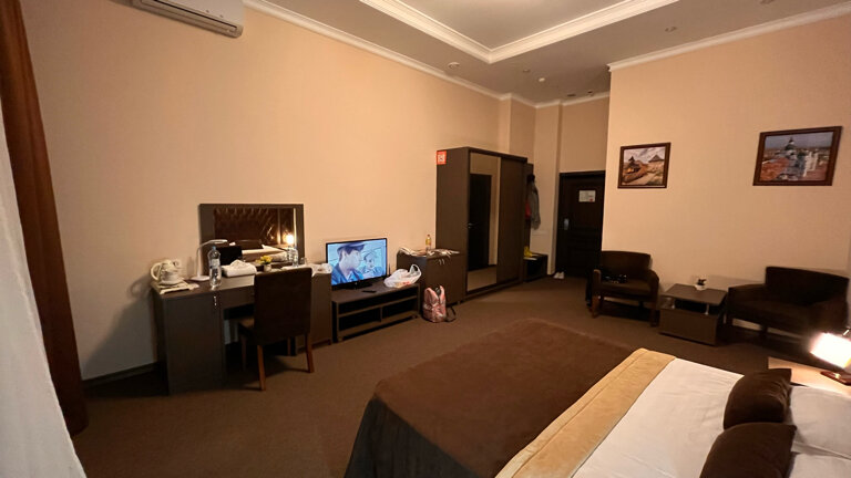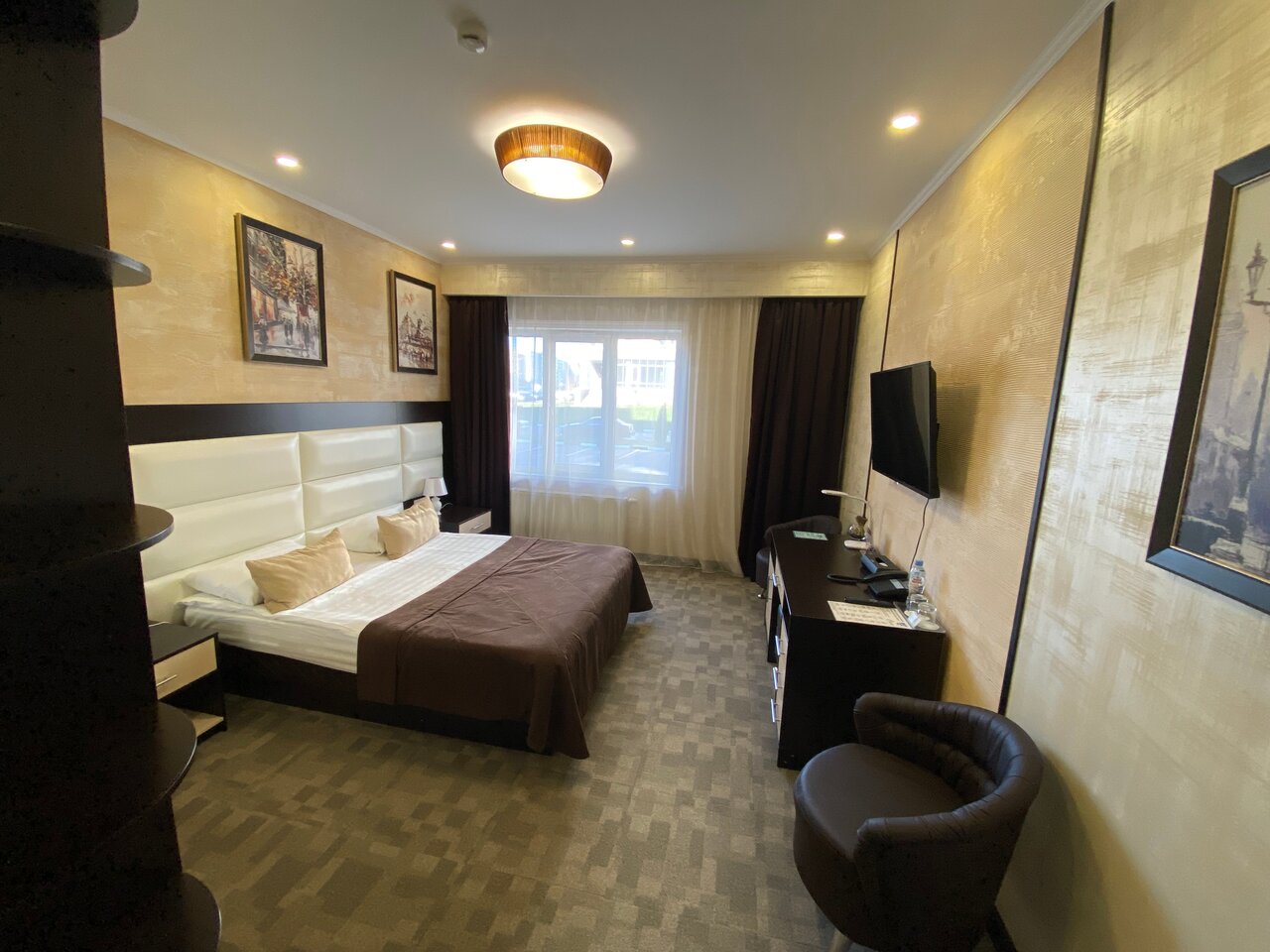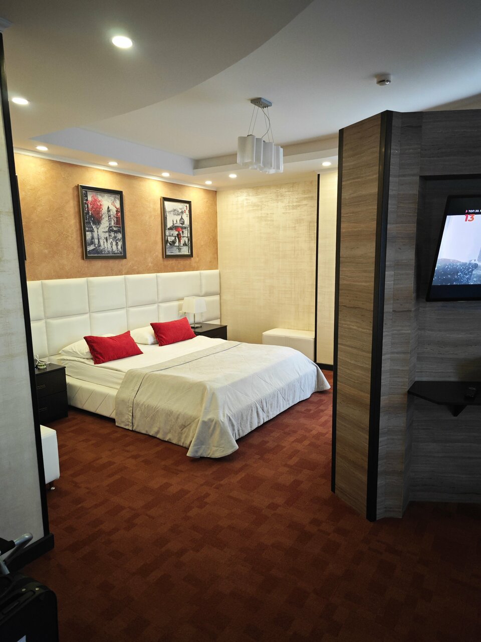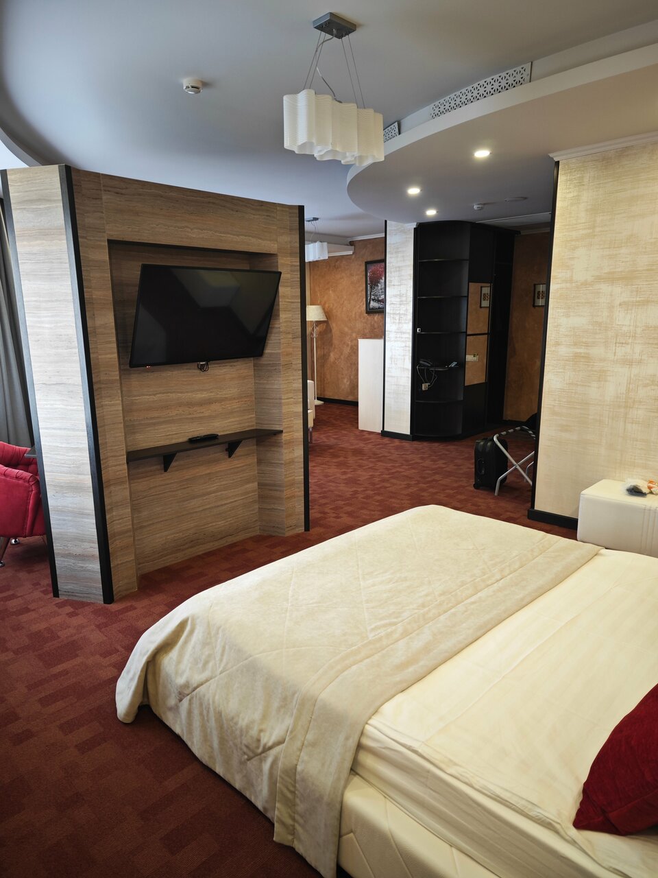 В номере люкс довольно твердый матрас. Нет возможности замены. В целом номер чистый. В ресторане вкусная еда. Обслуживание хорошее. На завтраке в целом все стандартно, при этом обычная вода ужасная на вкус, компот забродивший. Есть возможность посещения сауны и бассейна.