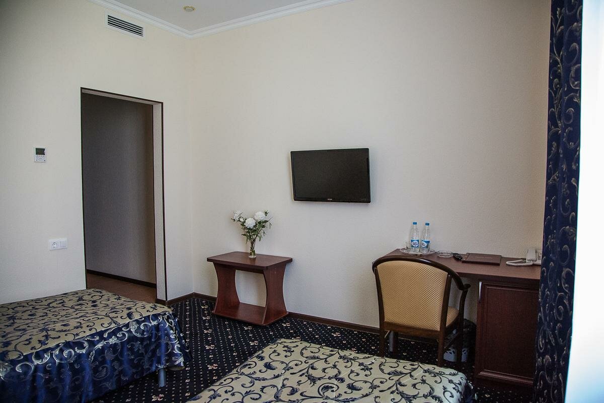 Интерьер номеров и самого отеля на твёрдую четверку, не было ощущения изношенности и дешевизны. Убирали исправно. Спортзала и сауны нет, воду в номер давали раз за три дня проживания. Зубной щётки нет. Шведского стола нет, завтрак: яичница, каша, блины, чай или кофе. Приготовлено хорошо, но для некоторых будет маловато.