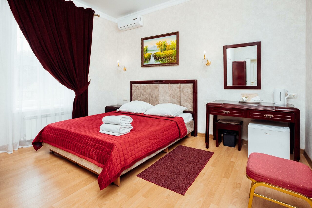 Чисто, уютно, тв, чайник, кондиционер, большая кровать, удобства все в номере, относительно не дорого, в тихом районе, удобное расположение, недалеко пятёрочка и магнит. Возможна стоянка авто на территории. Нам всё понравилось)