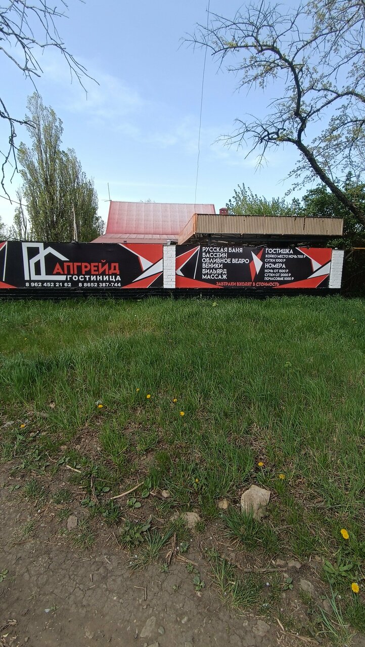 Гостиница «Апгрейд» (Ставрополь) расположена в Промышленном районе (4-я Промышленная ул., 1). Работает круглосуточно. Номера от 1000 до 2000 ₽/ночь. Удобства: парковка, бассейн, баня, сауна, Wi-Fi, кондиционер, телевизор, холодильник, общая кухня, прачечная. Дополнительно: массаж, завтрак, площадка для пикника. До центра — менее 5 км, рядом парк. Контакты: +7 (8652) 38-77-44, +7 (962) 452-21-62, +7 (8652) 62-21-62.