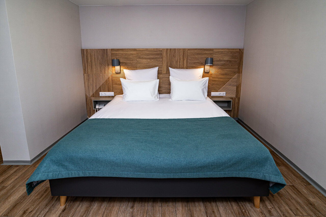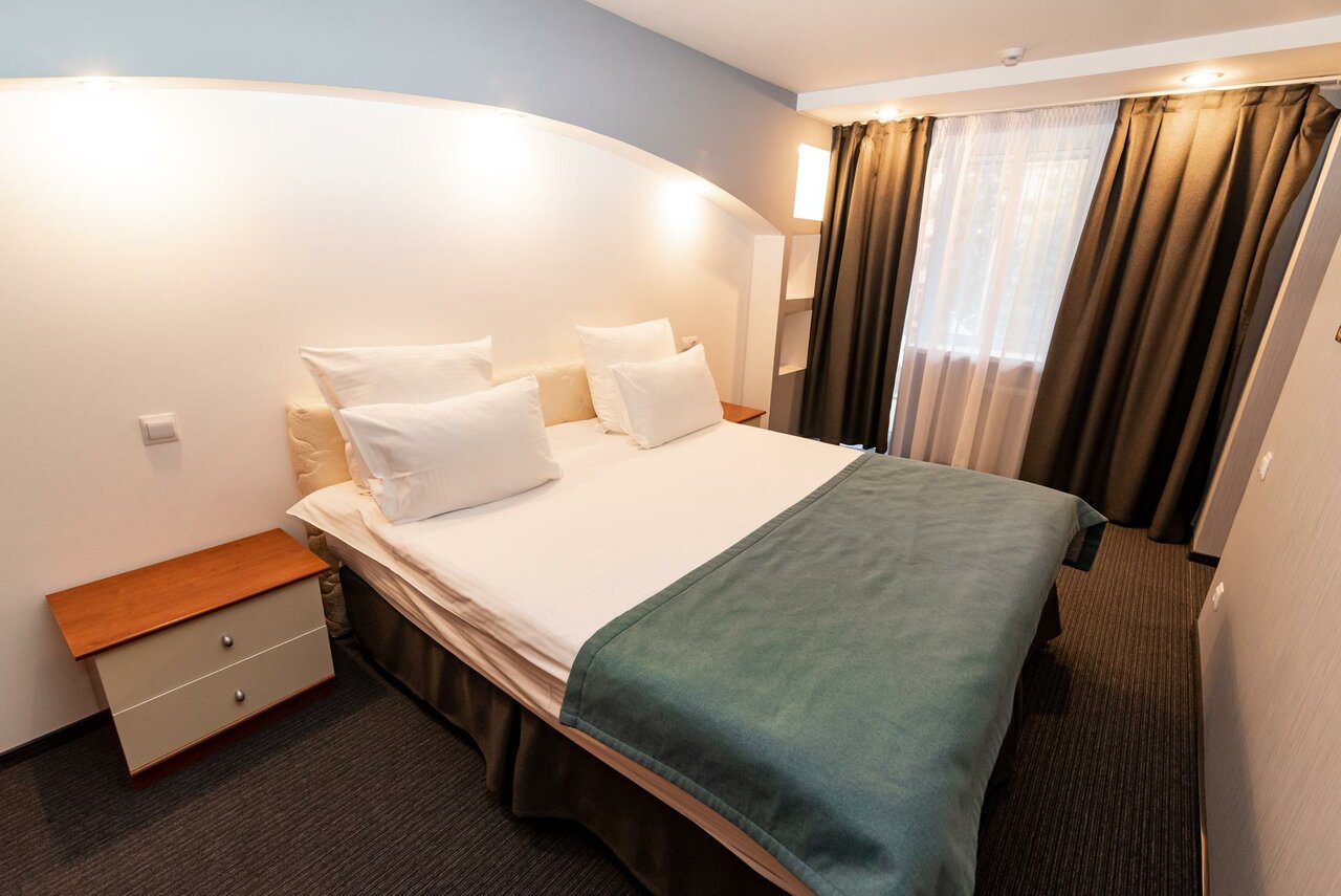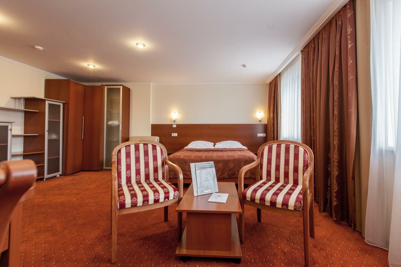 Просторный номер с большой двуспальной или двумя раздельными кроватями и удобным раскладным креслом. В номере: собственная ванная комната, выделенные зоны для работы и отдыха, гардеробом и всё необходимое для комфортного проживания.