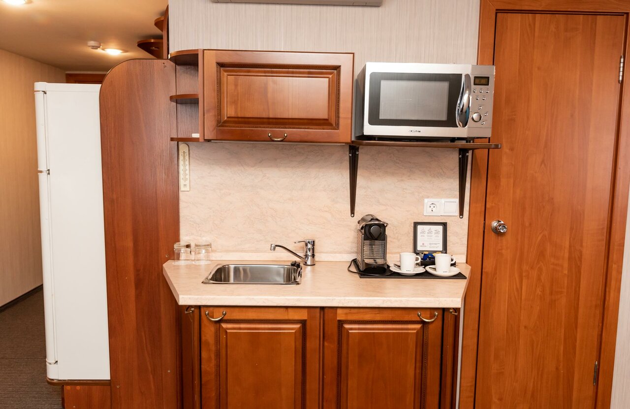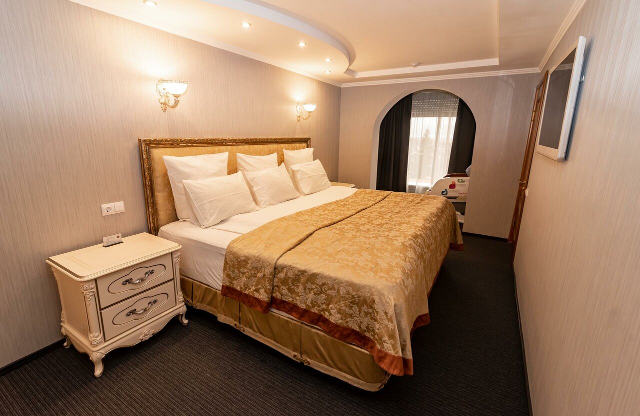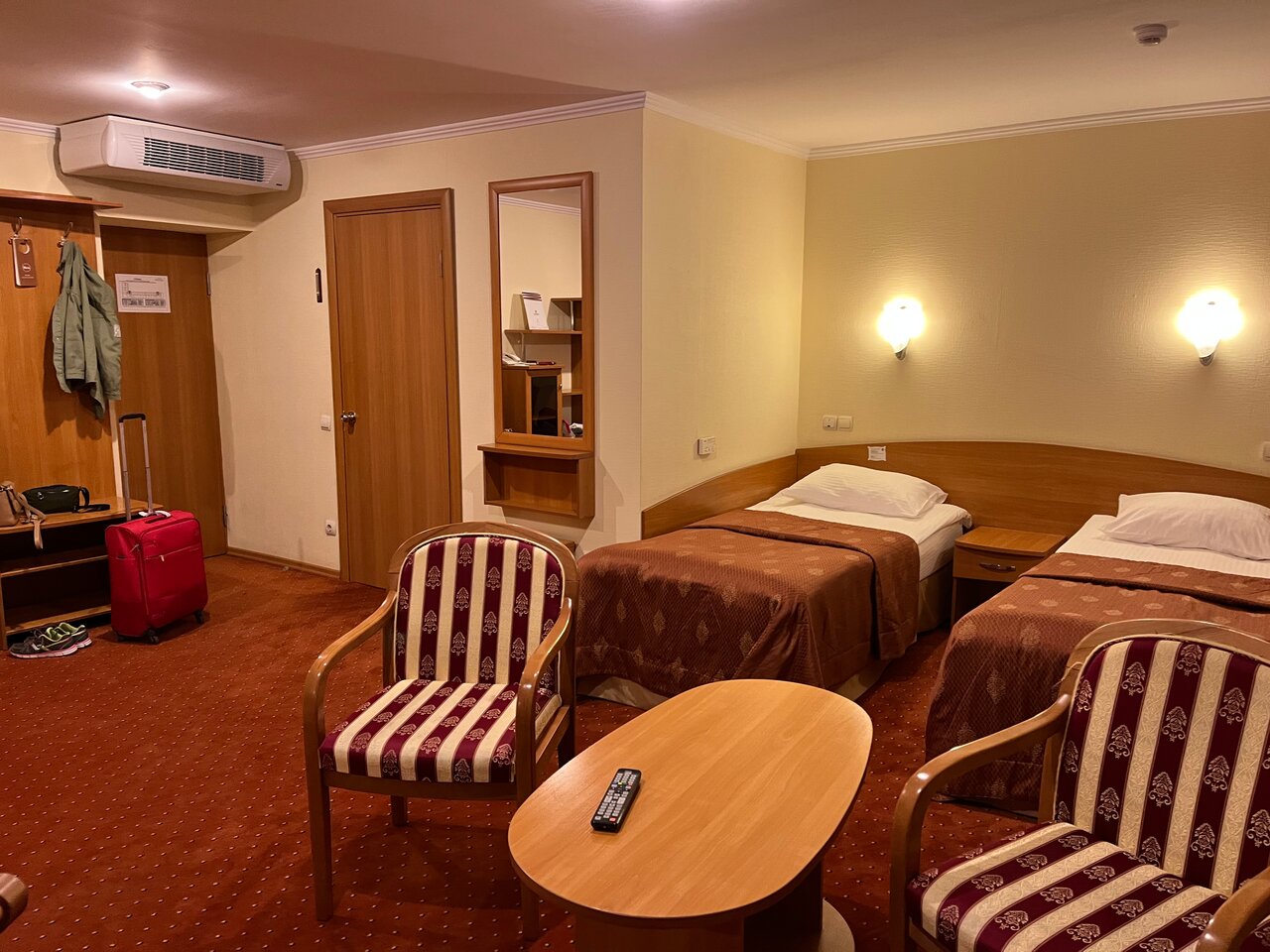 Просторный номер с большой двуспальной или двумя раздельными кроватями и удобным раскладным креслом. В номере: собственная ванная комната, выделенные зоны для работы и отдыха, гардеробом и всё необходимое для комфортного проживания.