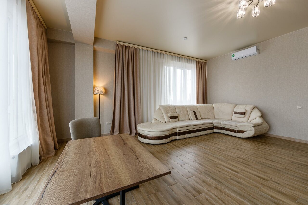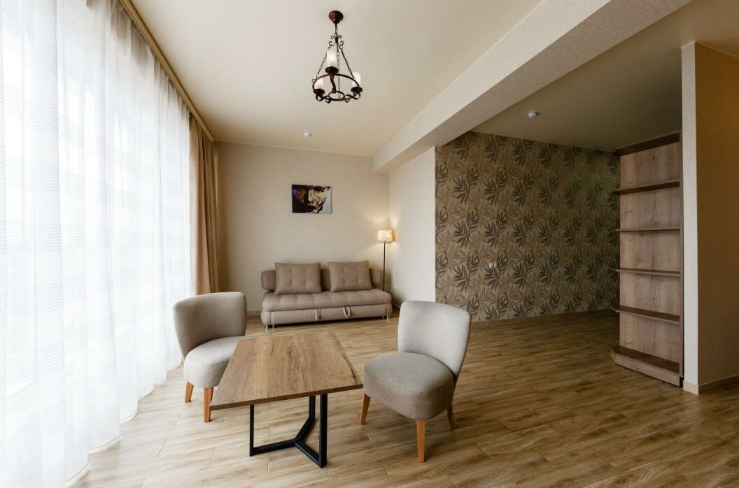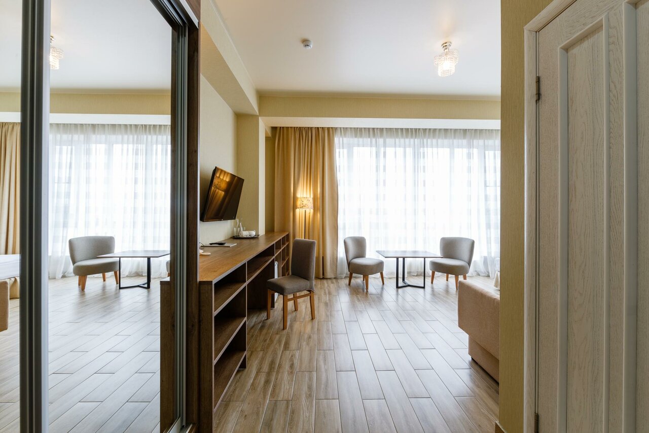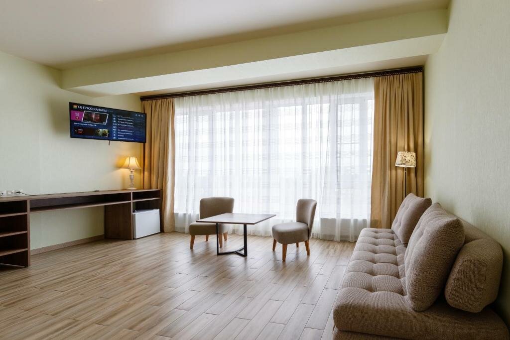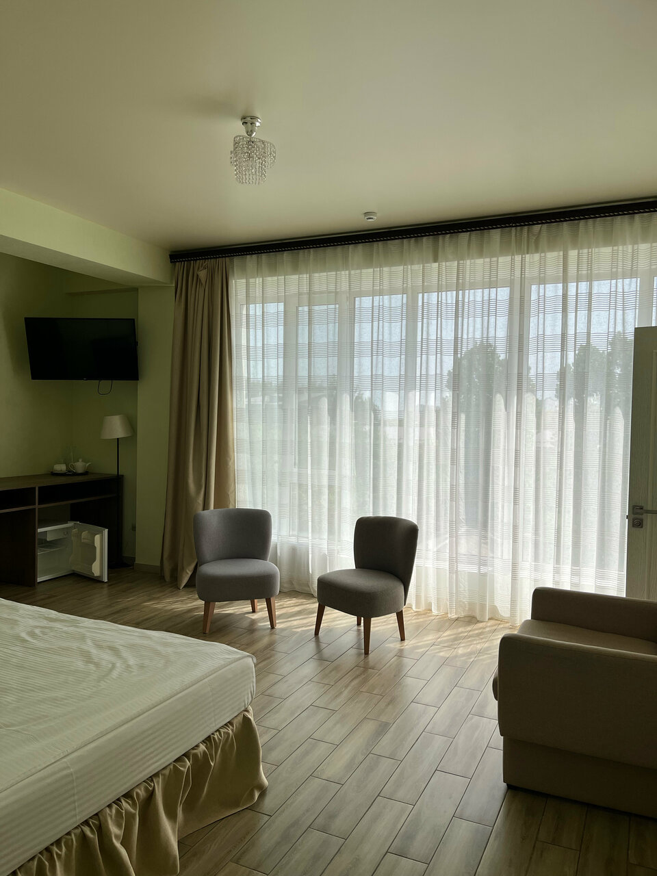 Большой номер класса люкс, зоны спальни и гостиной разделены перегородкой.