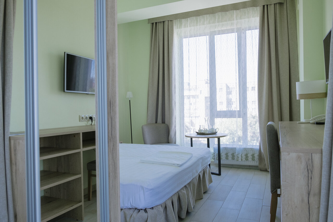 Одноместное размещение в номере с большой кроватью 180х200. Площадь 18-20 кв м.