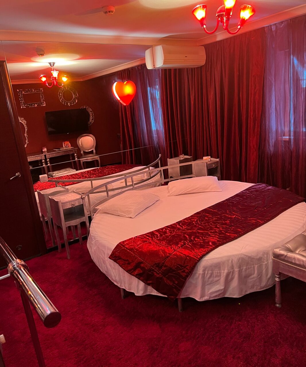 «Зеркальный» — номер класса «Комфорт», с огромной круглой кроватью. Зеркало на всю стену отражает красоту этих апартаментов. Стены декорированы необычными рамками и дизайнерским зеркалом. Пол устлан пушистым ковролином. Разувайтесь скорее и ощутит...