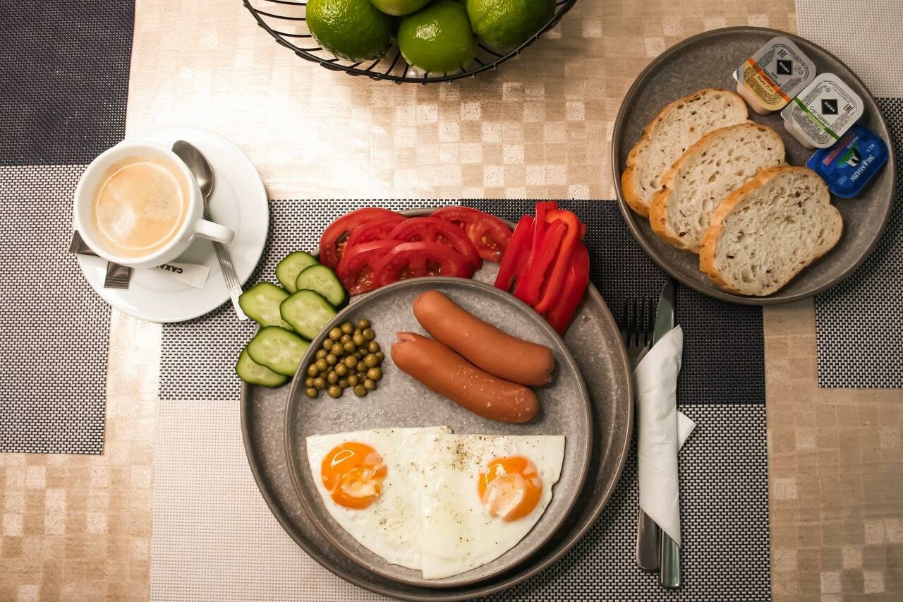 Наш отель предлагает вам утренние завтраки. На вашей тарелке будет пышная яичница, рядом с ней – пара ароматных сосисок. Добавим свежую нарезку из овощей и ломтики сыра. • Дополнительно в завтрак входят: хлеб/соус/масло/джем