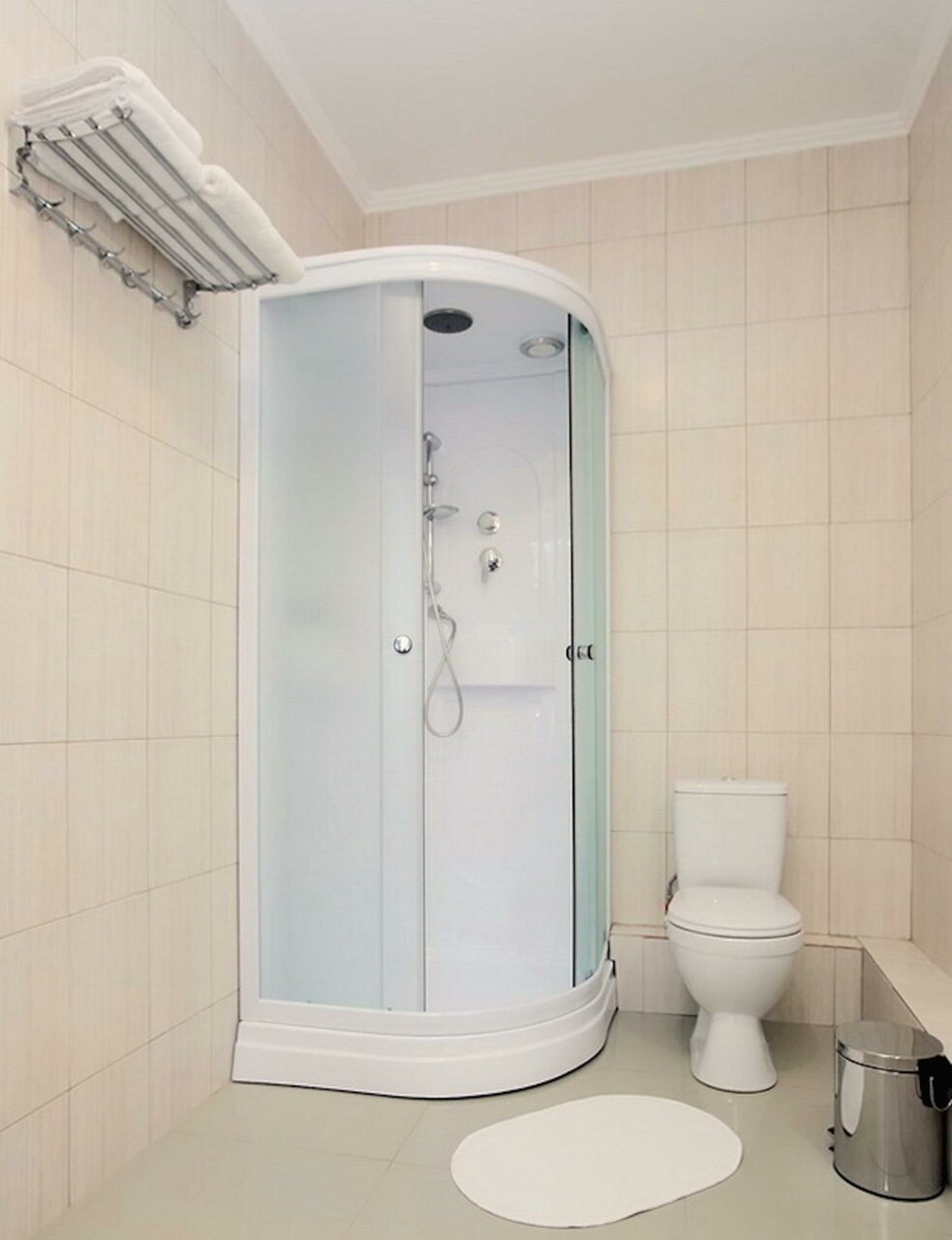 Номер Стандарт трехместный: вместимость - 3 человека. Оборудование: двуспальная кровать или две односпальных кровати и кресло-кровать, санузел с душевой кабиной, фен, телевизор, Wi-fi, холодильник, вид на улицу.