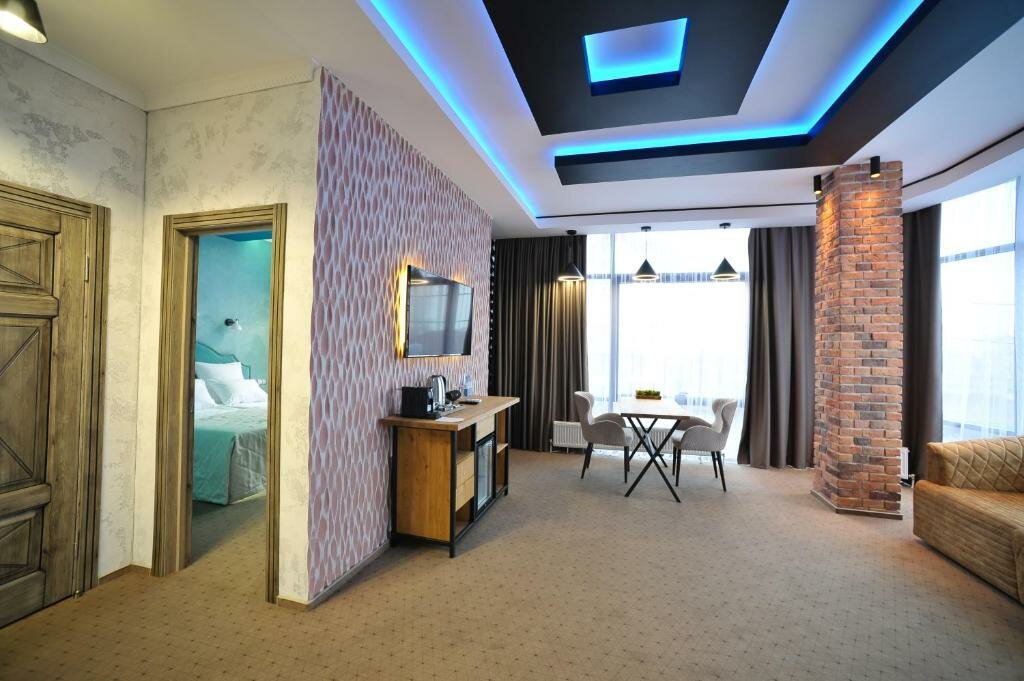 Люкс с кроватью King Size — просторный номер (45 м²) с раскладывающимся диваном и подсветкой во всех комнатах. Уютная обеденная зона, кофемашина, мини-бар и многое другое для вашего комфортного отдыха. Максимум удобства для 4 человек.