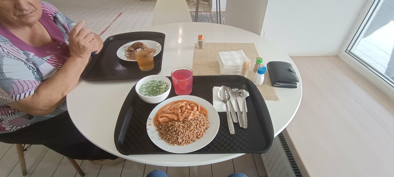 - Вкусная еда в столовой (плов, печеночные котлеты, салаты).