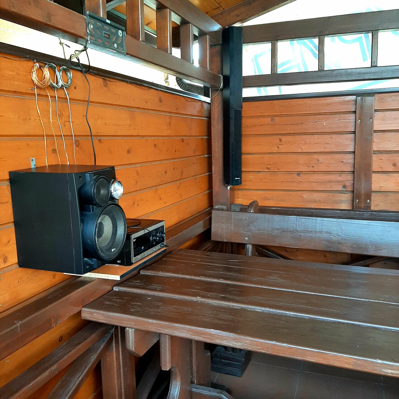 - Добротная мебель в беседке.; Работающий камин.; Уютный дворик.; Наличие нарукавников для плавания.; Предоставление дров.
