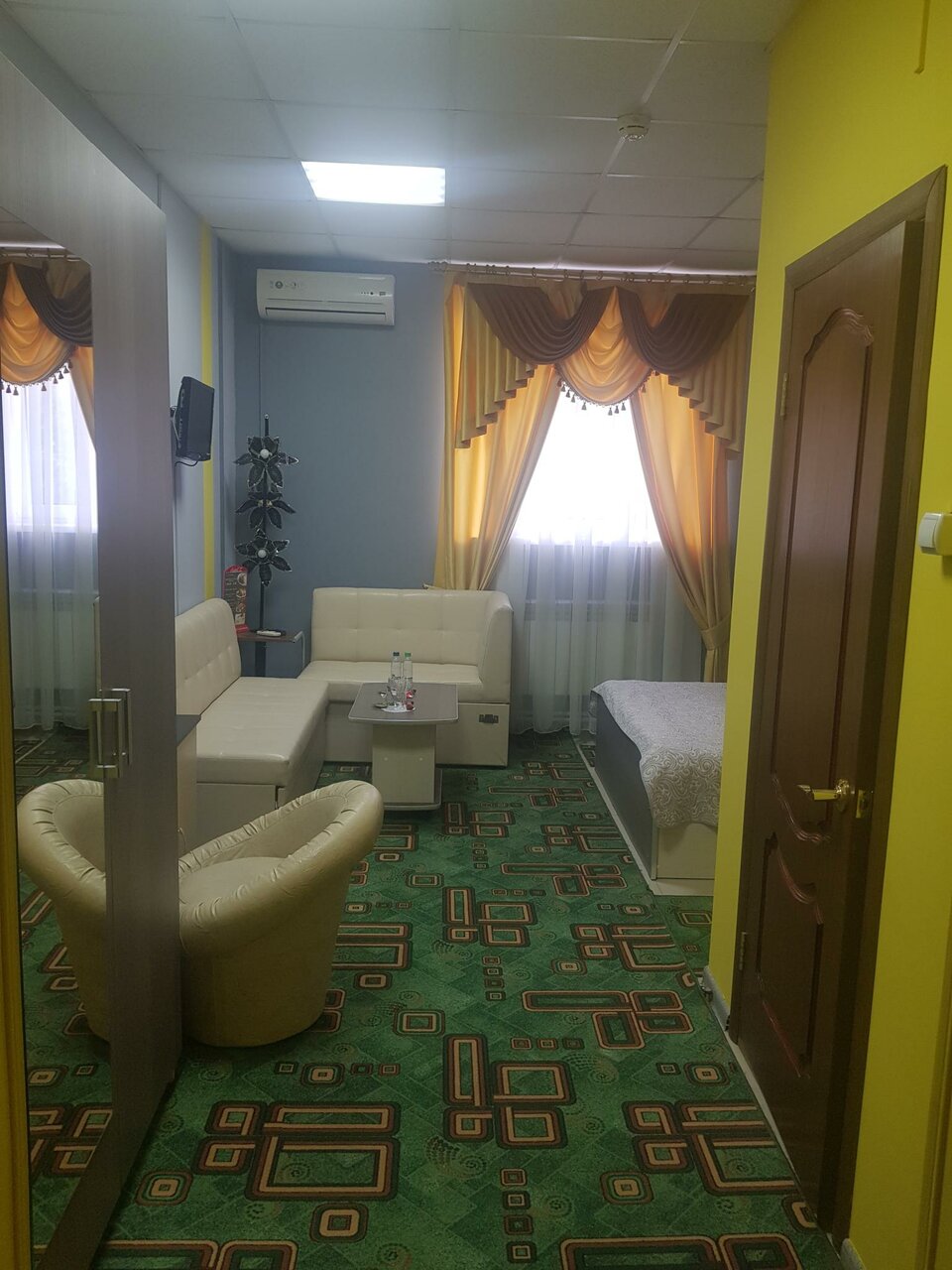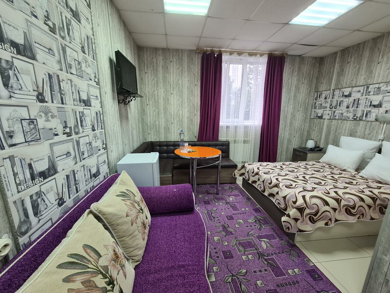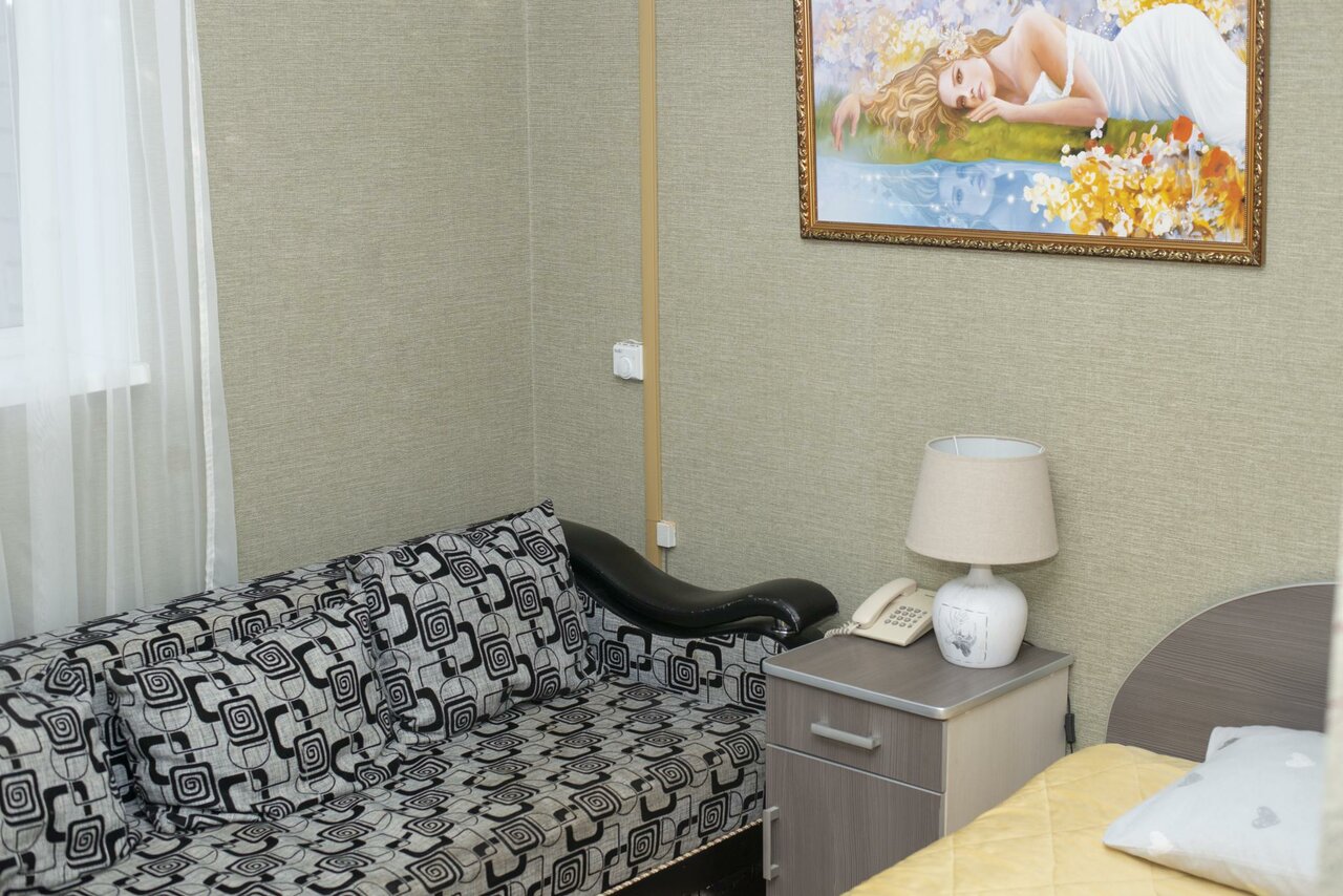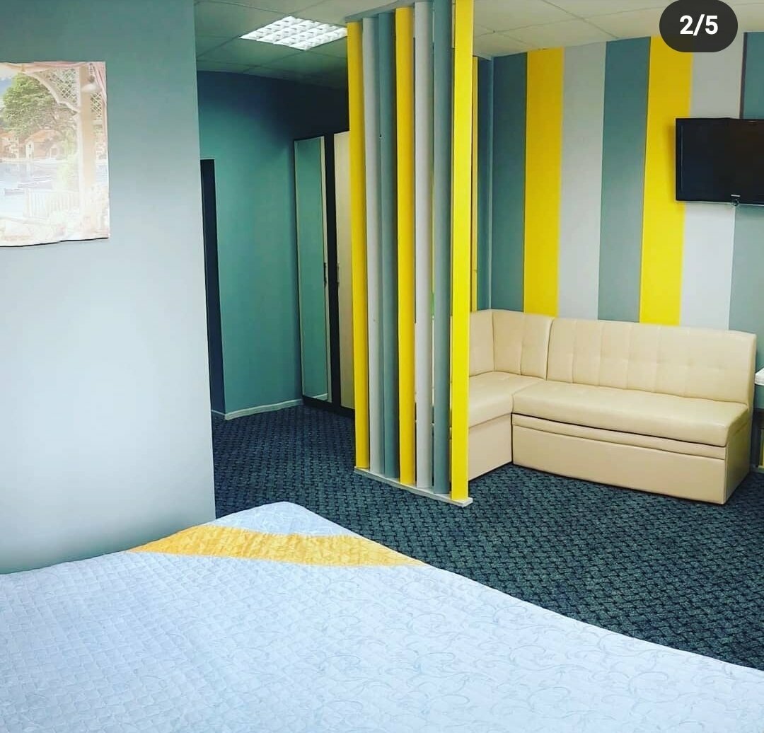 - В номере есть холодильник, телевизор, диван, кровать.