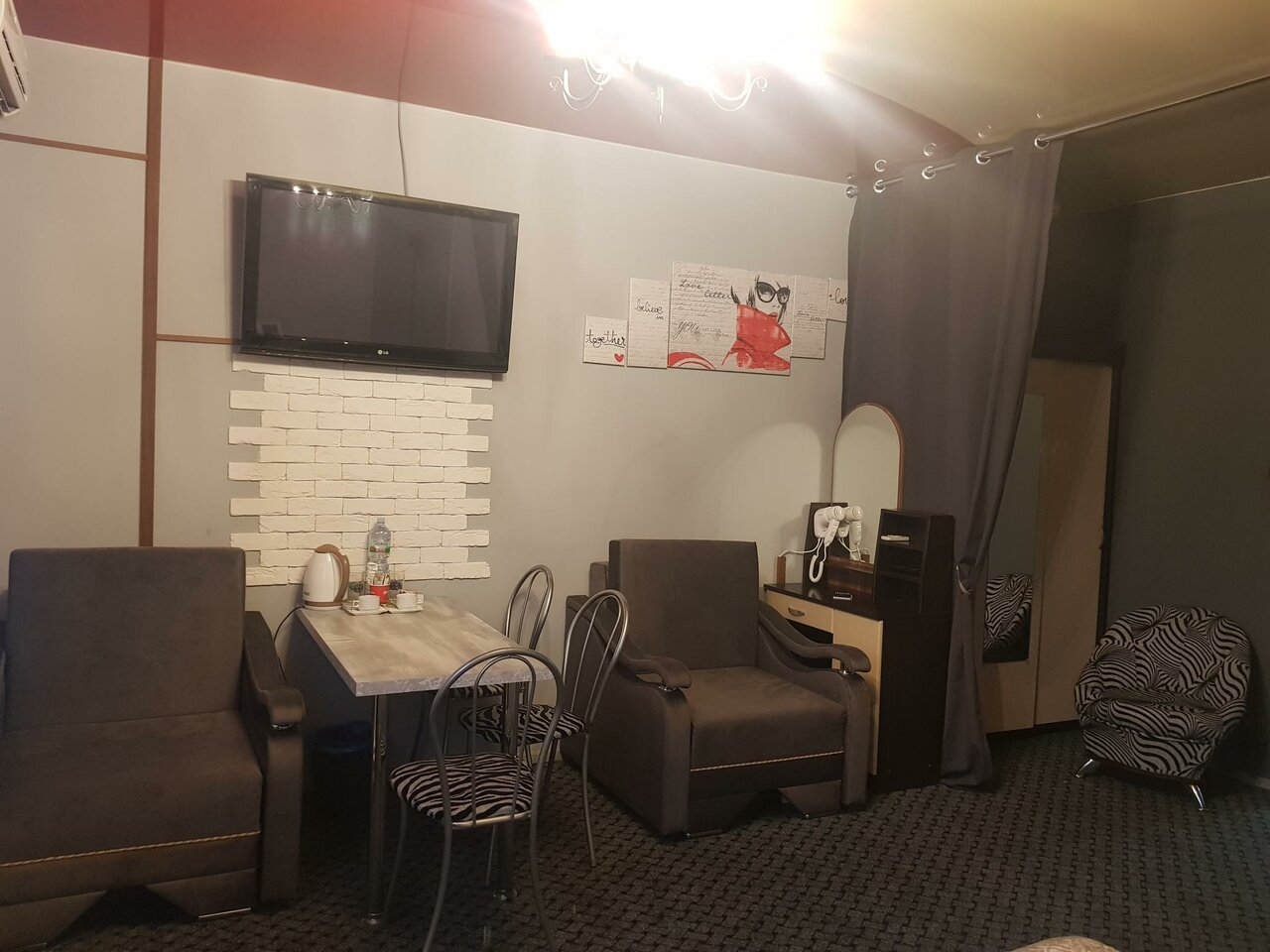 Сильно убавил в оценке из-за отсутствия кондиционера, который был обещан по телефону при броне, и за наличие в номере недокументированного животного ‘Фёдора’. Персоналу 4+, ‘продают’ то, что имеют. По факту номер ну не вызывает приятных впечатлений, от сантехники до полов. Размер хороший, но напичкан не нужными деталями…и да… холодильник прям под ухом у кровати — это просто огонь. Так сказать в дополнение к пердяшкам и музыкантам на улице. А окно не закрыть, дышать нечем. Ну и стены тонкие, соседей слышно будто в комнате своей.
