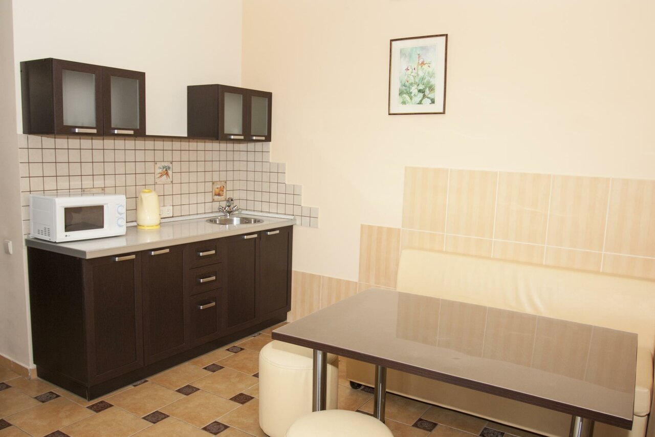- Полноценная кухня (посуда, чайник, микроволновка, холодильник).