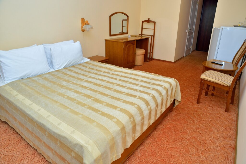 Двухместный номер с кондиционером, холодильником и ванной комнатой. В номере окно, большая двуспальная кровать, халаты, тапочки. Завтрак включен.