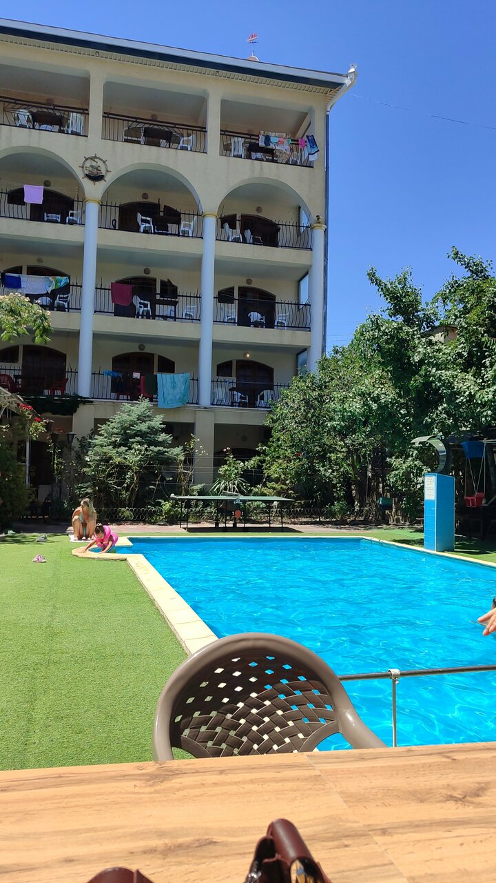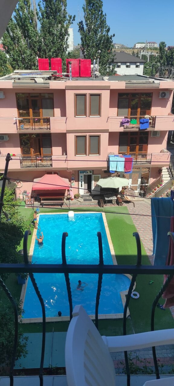 Всем довольны. Расположение прекрасное. Номер оформлен со вкусом. Достаточно чисто. Хороший вид из окон. Хозяйка Марина милая и приветливая, все рассказала и объяснила. Следит за территорией, гостями, детьми в бассейне. Бассейн отдельная тема. Чистый, приятный. Территория очень располагающая. Из минусов — продавленный диван в номере. А в целом — рекомендую!