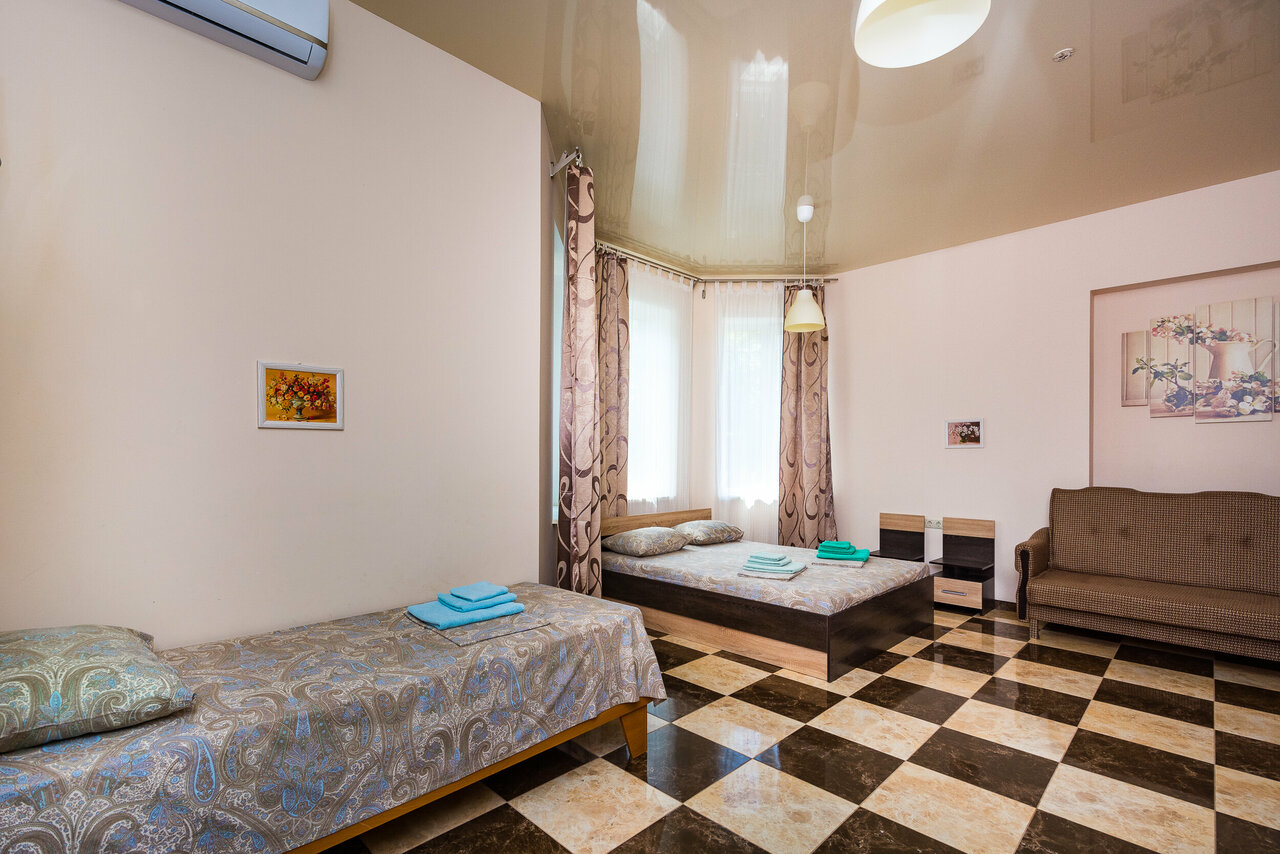 Номер 'Комфорт', 24 кв.м., со всеми удобствами, числе удобств - кондиционер, холодильник, ЖК-телевизор, сейф, фен.Своя ванная комната, круглосуточно холодная и горячая вода.Хорошая звукоизоляция, высокие потолки, москитные сетки.
