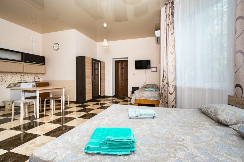 Номер 32 кв.м., со всеми удобствами, оснащен всем необходимым, числе удобств - кондиционер, холодильник, ЖК-телевизор, сейф, фен.Своя ванная комната, круглосуточно холодная и горячая вода.Хорошая звукоизоляция, высокие потолки, москитные сетки.