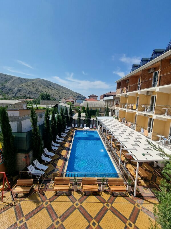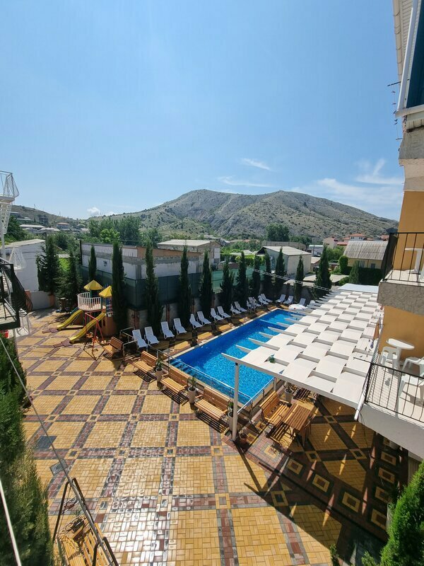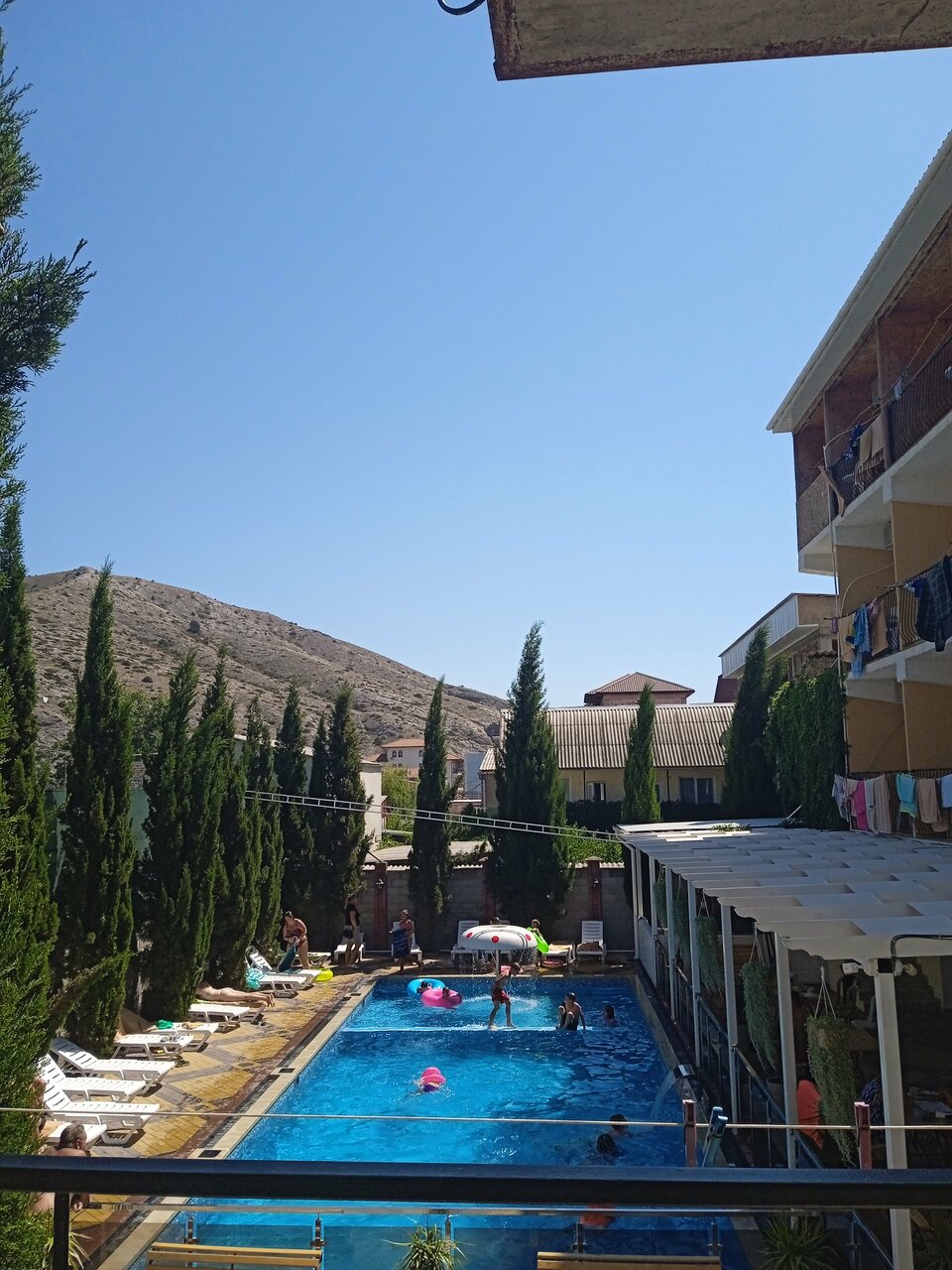 Отдыхали в июле 2021 .Большой двор ,благодаря чему машина стояла во дворе ,а не на улице. До моря ,10 минут не спешным шагом.Уборка номеров по желанию. А балкон с видом на гору Алчак .Кухня ,стиральная машина ,уютный номер.. что еще надо! Рядом не дорогая вполне приличная столовая. Единственный минус- в душе солёная вода. Но в свободном доступе питьевая вода в 5л. бутылках.