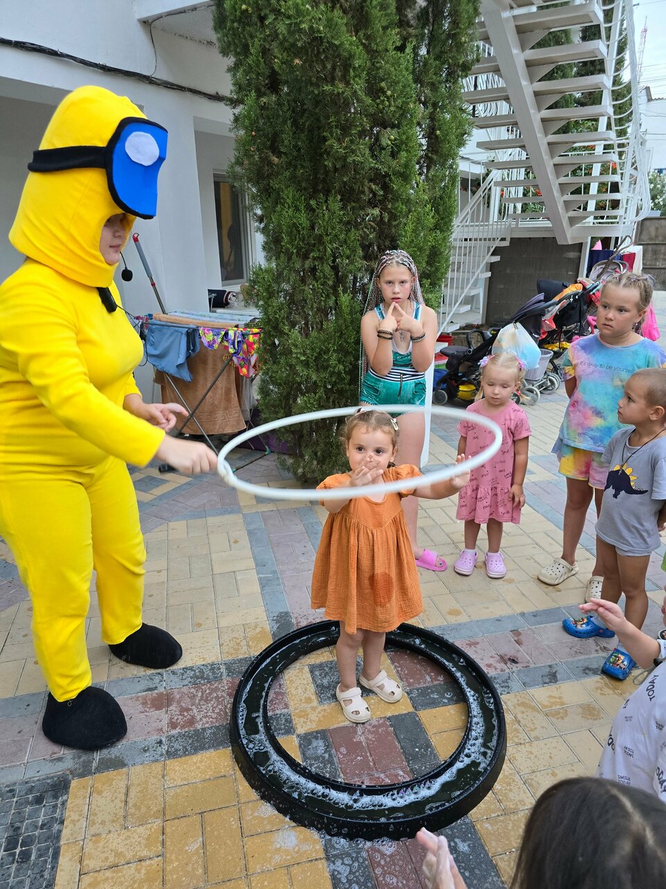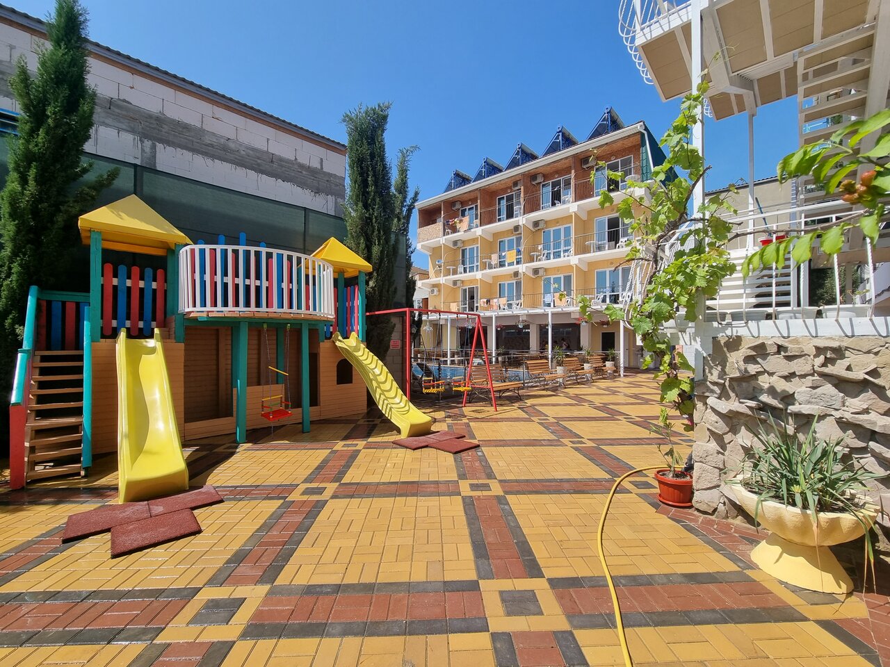 Очень нам понравился отдых в отеле! Дети играли в игровой комнате, были несколько раз за неделю аниматоры приглашены — очень здорово детей развлекали!!! Возможность самим приготовить все, что поделаешь: посуда есть на кухне, удобно. Пиццы правда в отеле не было, как я ожидала, прочитав сторонние отзывы об отеле( мы нашли место, где готовят вкусную пиццу по дороге к морю)) Номера тесноваты, но очень красивый вид на горы с номера!! Просторный двор, автостоянка, уютная беседка! Всё для отдыха с детками здесь есть. Детей теснота не смущала))