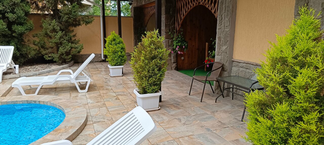 Хороший дом отдыха, тихо и комфортно, большой бассейн, рядом горы и красивый вид. До моря на автобусе минут 15. Прекрасно подошёл для отдыха с детьми