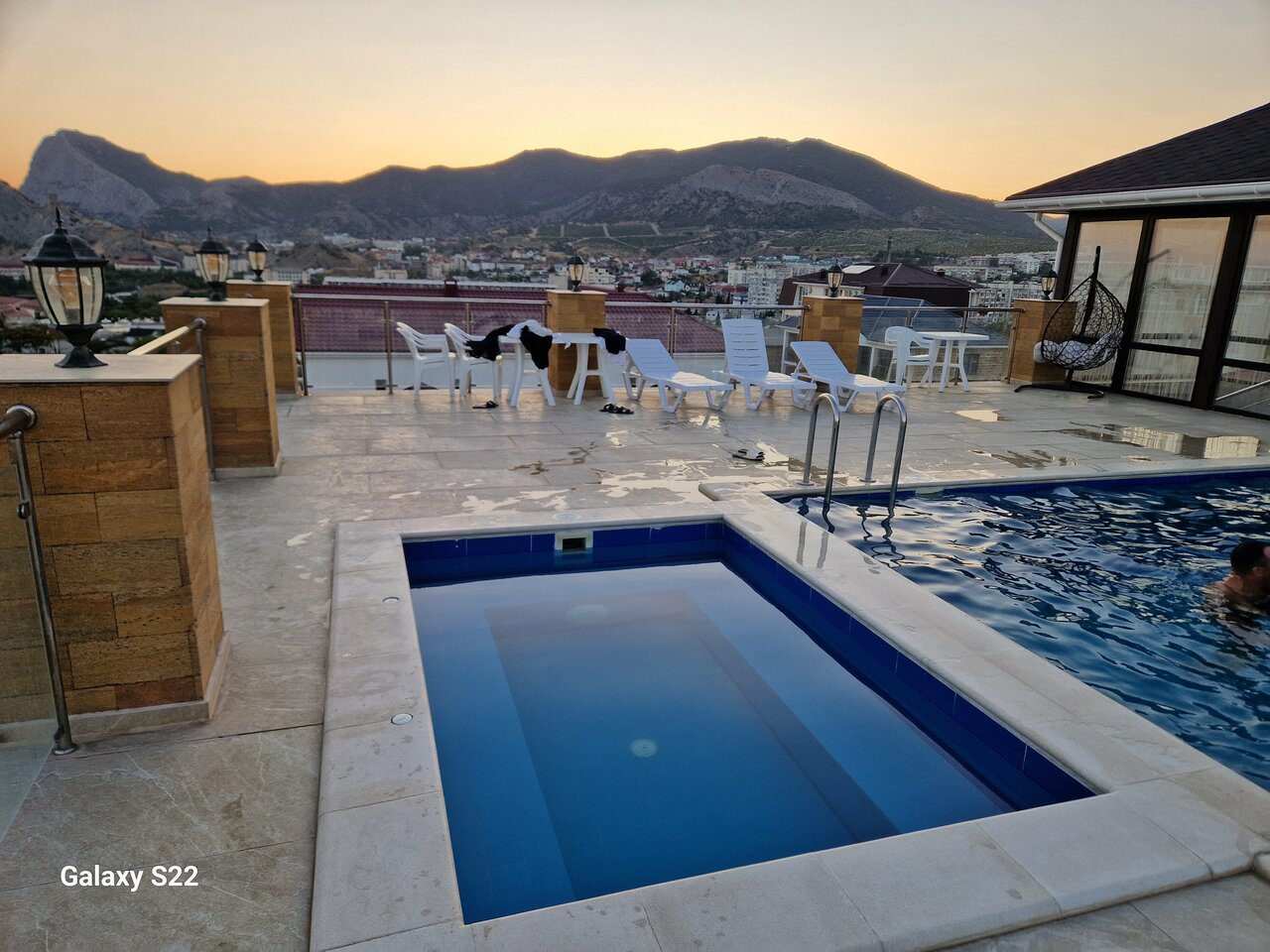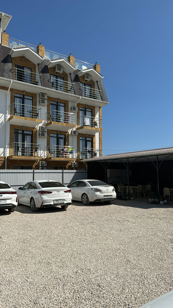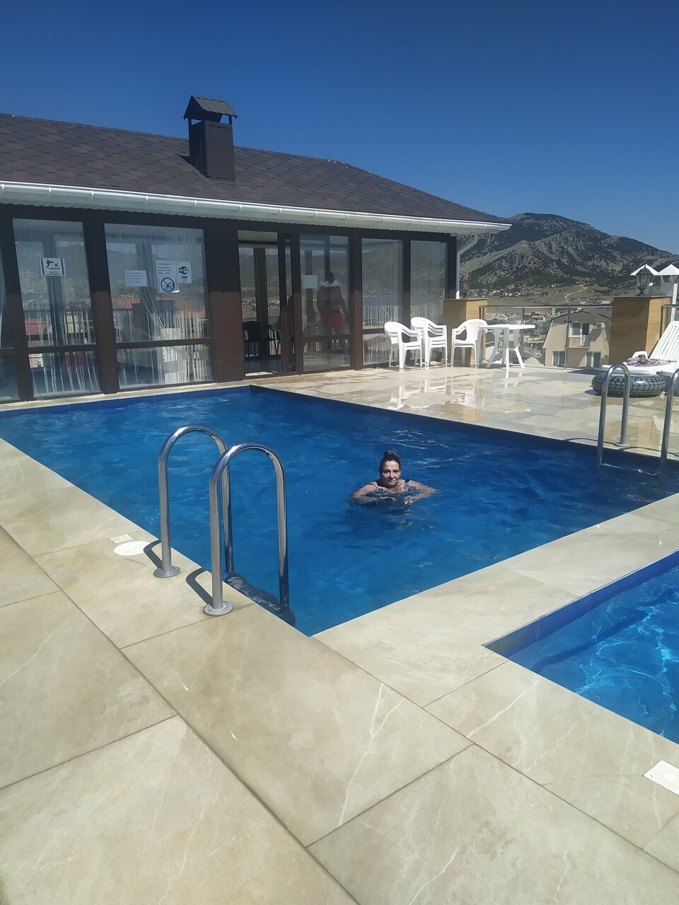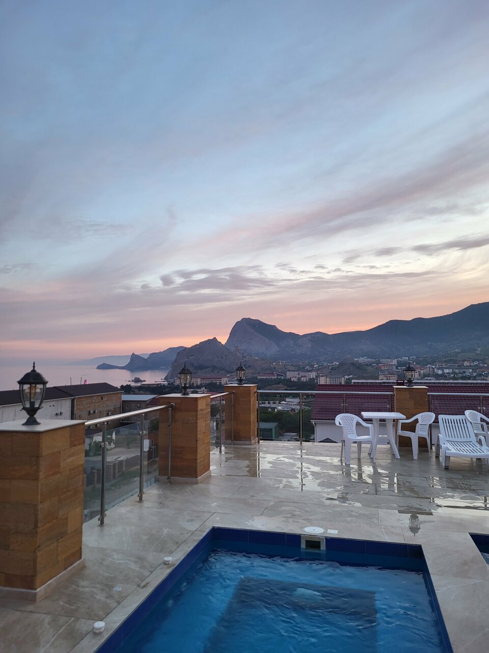 Хороший отель в Судаке, есть кухня на первом этаже и на улице. Большая парковка, есть трансфер на море и к столовым на гольфкаре (с 8 до 20). Хороший бассейн и джакузи на крыше. Для детей установлен батут и детская площадка. Радушные хозяева. Минусы, что кондиционер в спальне висит напротив кровати, на ночь не включить — дует. Но нам хватало кондиционера в гостиной. Уборка с 8 утра вместо будильника, слышно как чем-то гремят за дверью. Чистота средняя.