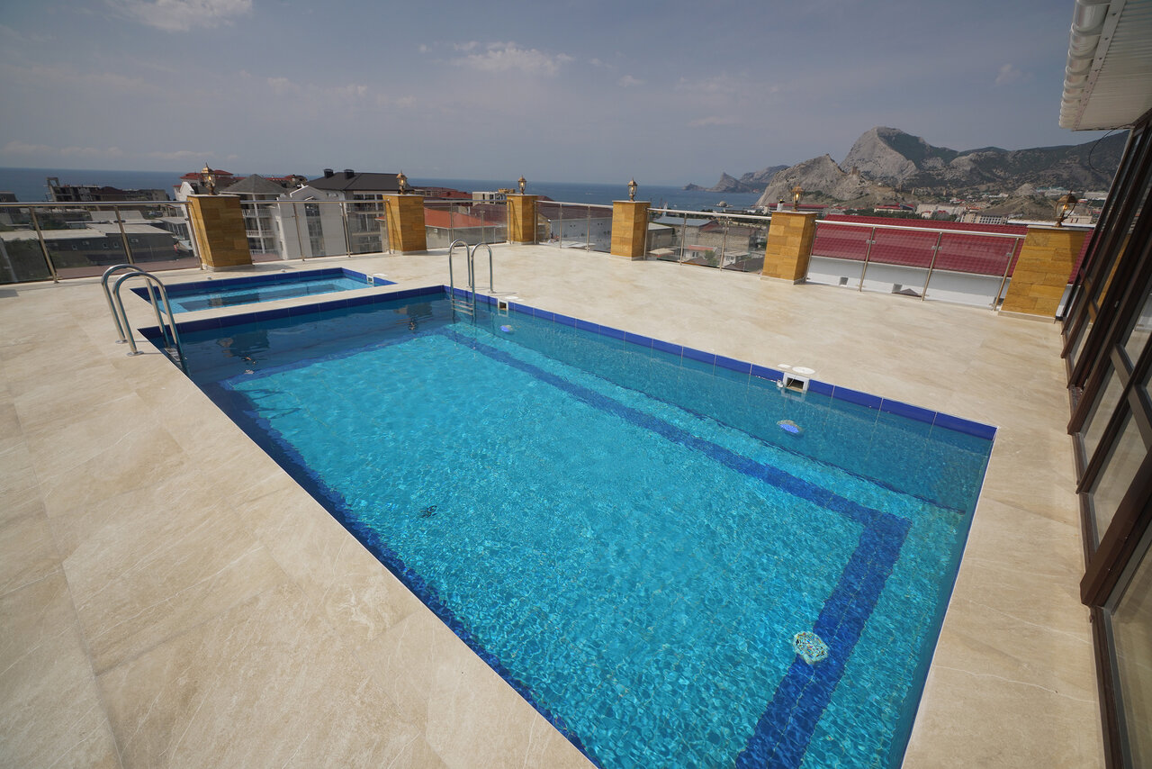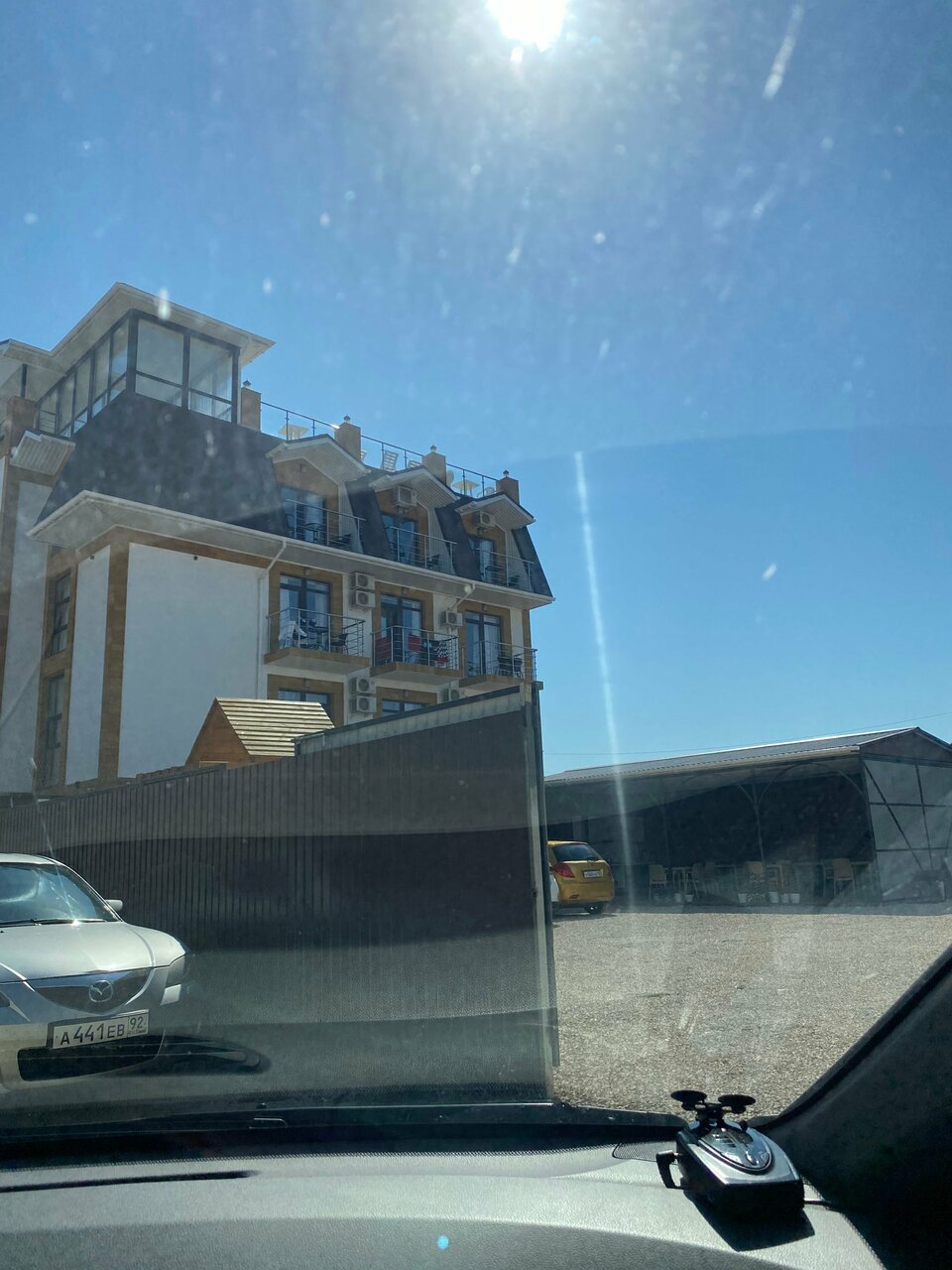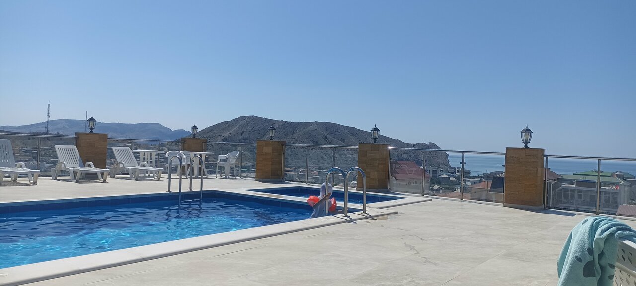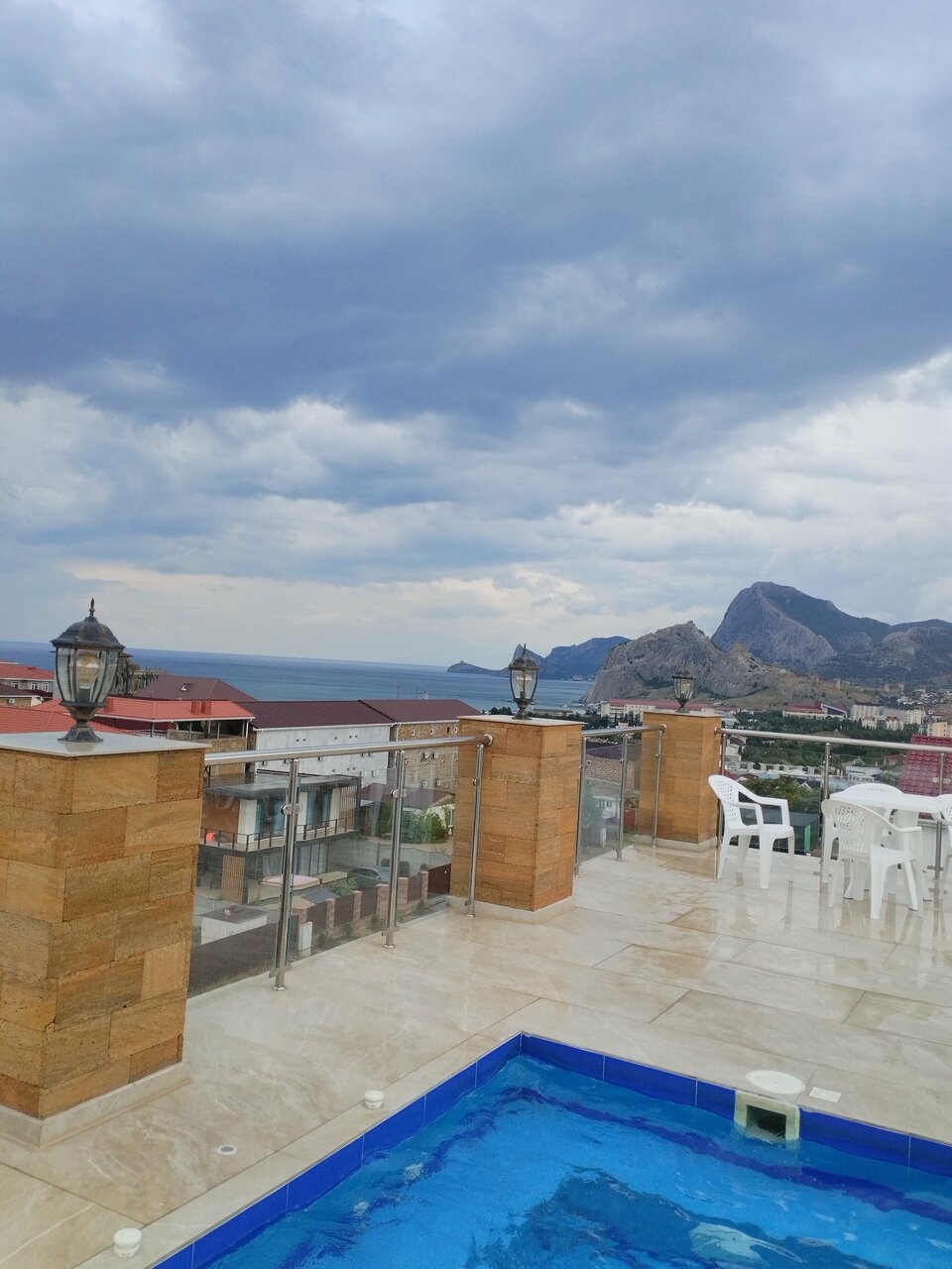 Хороший отель в Судаке, есть кухня на первом этаже и на улице. Большая парковка, есть трансфер на море и к столовым на гольфкаре (с 8 до 20). Хороший бассейн и джакузи на крыше. Для детей установлен батут и детская площадка. Радушные хозяева. Минусы, что кондиционер в спальне висит напротив кровати, на ночь не включить — дует. Но нам хватало кондиционера в гостиной. Уборка с 8 утра вместо будильника, слышно как чем-то гремят за дверью. Чистота средняя.
