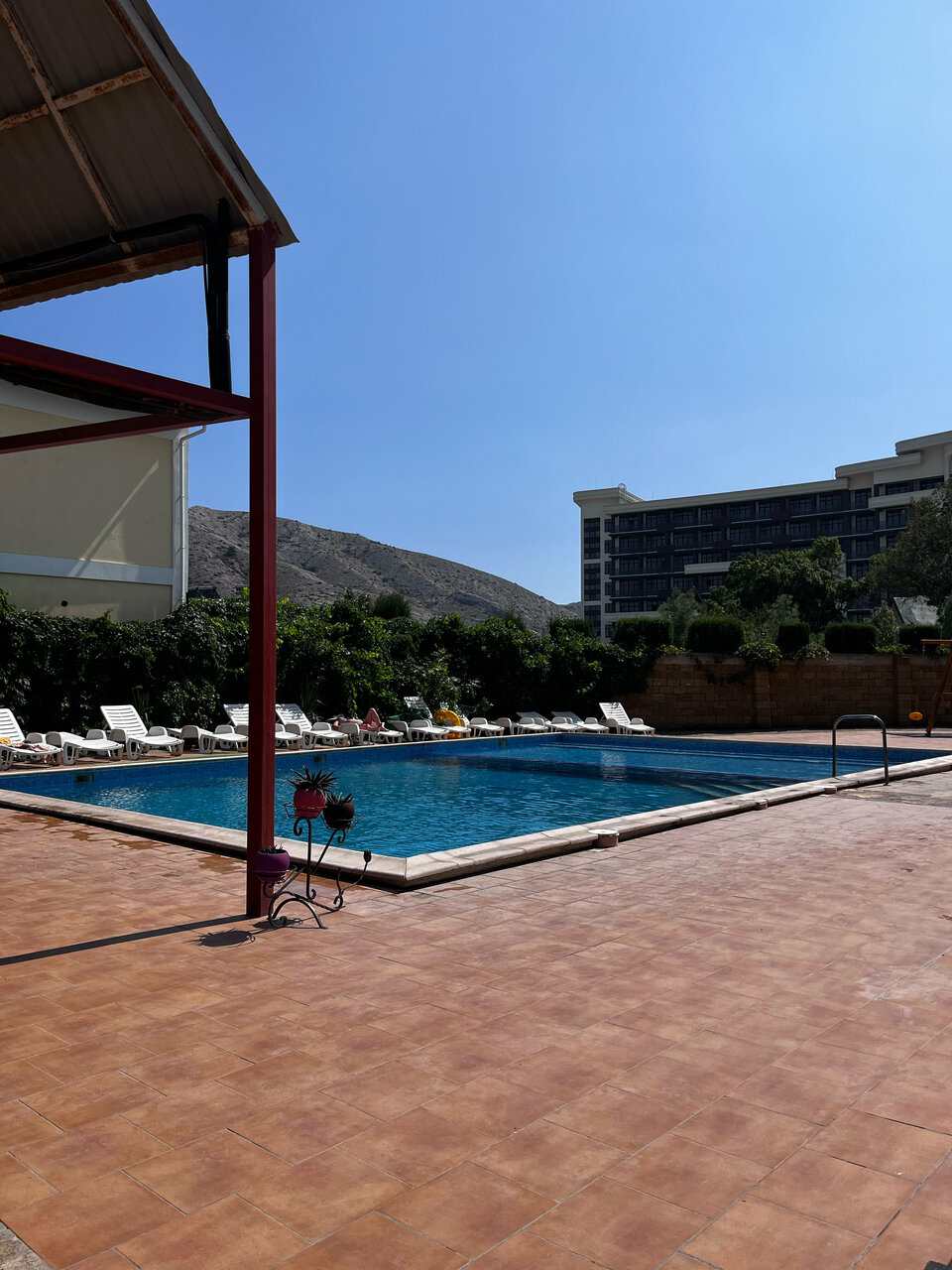Снимали большой двухкомнатный номер на четверых. В номере была посуда, чайник, средства гигиены, фен и халаты. В номере чисто, просторно. Конечно номерной фонд немного устал, но сам отель хороший, с удобным расположением, бассейном и летней зоной отдыха с мангалом. Территория ухоженная, кругом цветы.